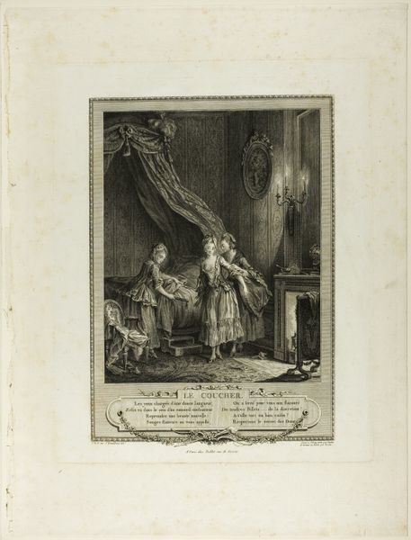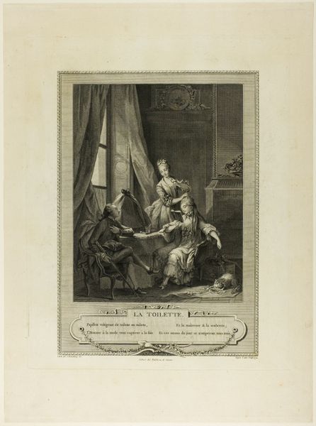 Editor: Here we have Charles Louis Lingée’s “Confidences, from Monument du Costume Physique et Moral de la fin du Dix-huitième siècle,” an etching on paper from 1774. It depicts two elegantly dressed women indoors; there’s such intricacy in the details of their gowns. I'm curious, what visual elements strike you most when you examine this piece? Curator: The dynamism achieved through line is noteworthy. Observe how Lingée orchestrates a visual symphony, employing hatching and cross-hatching techniques to articulate form, texture, and value. The play of light and shadow, achieved through the strategic deployment of these lines, constructs a spatial framework within which the subjects exist. Editor: I hadn't considered the impact of the lines to create that dimensionality, I was too focused on the details of the women and their setting. How does this linear quality influence your reading of the work's emotional tone? Curator: Semiotically, the precision and delicacy of the line imbue the scene with a sense of refinement and decorum characteristic of the Rococo. This formal restraint serves as a visual metaphor for the societal constraints governing intimate exchange. The tight composition and shallow depth, reinforced by the limited tonal range, heighten the tension and focus our attention on the central figures. Do you perceive how the artist emphasizes certain shapes and forms to lead our gaze? Editor: I see it now, especially how the gowns blend into each other and how the composition makes their faces appear more intimate. The setting feels less important than the implied connection. Curator: Precisely. This formal analysis refines our understanding, underscoring how visual choices can dictate narrative interpretation. Editor: I understand now how attention to formal elements clarifies my response to the work. Thank you! Curator: It is through such dialogues that we deepen our engagement with the artistic endeavor, bridging the gap between mere observation and informed interpretation.