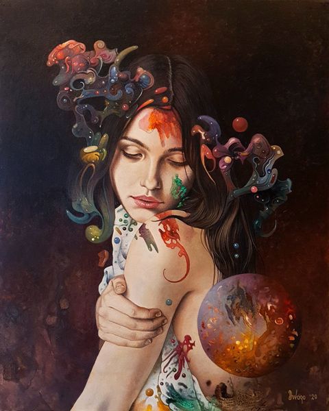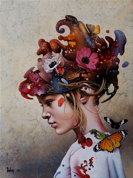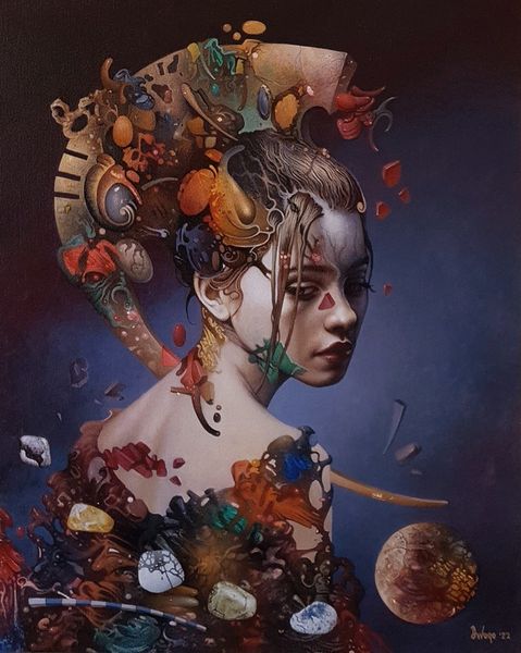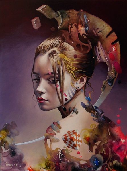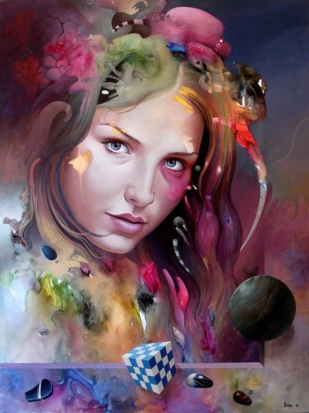 Editor: Dragan Ilić Di Vogo's "Zvoncica," created in 2018, presents a striking portrait in acrylic on canvas. I’m immediately struck by the contrast between the realism of the face and the surreal, almost dreamlike elements swirling around it. How do you interpret this work, especially considering the juxtaposition of familiar imagery with the unexpected? Curator: It's precisely that contrast which grabs my attention, too. The familiar image of Tinkerbell immediately places us within a very specific cultural narrative— childhood, Disney, innocence. But then look at how that imagery is destabilized, almost erupting from the subject's head in a chaotic and fragmented way. Consider what that juxtaposition might signify: the tension between idealized childhood memories and the more complex, perhaps even unsettling, realities of adulthood. The fairy-tale image becomes entangled with what appear to be darker or at least more ambiguous symbols and forms. What do those floating cubes or dark, hollow shapes evoke for you? Editor: They feel…disconnected, almost like thoughts or memories floating aimlessly. Is the artist suggesting that our idealized memories can be both comforting and a kind of prison? Curator: Perhaps. And that very tension – the push and pull between the known and the unknown, the idealized and the fragmented – is something we can see echoed in the tradition of surrealism, but also reaching back to alchemical and spiritual symbol systems where the inner world becomes an externalized landscape. It's like a waking dream, isn't it? Editor: Yes, I see that. It’s interesting how the artist uses recognizable figures to explore complex inner states. Curator: Indeed. And those contrasts offer space to contemplate the stories we tell ourselves. The personal and cultural memories we constantly reshape. Editor: This has definitely given me a richer understanding of the symbolic depth of this seemingly simple portrait. Curator: And I was reminded of how childhood imagery maintains such potent psychological power, even as it morphs with experience.