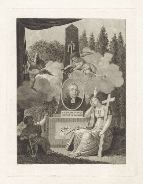 This print, "Monument voor Johannes Noordink," by Walraad Nieuwhoff, presents a meticulously structured composition rendered in monochrome. The monument at the center acts as a stark, vertical anchor, contrasting against the soft, undulating landscape. Note how the artist frames Noordink's silhouette within an oval medallion, a classic emblem of remembrance. The cherubic figures above introduce a thematic counterpoint, juxtaposing earthly loss with celestial promise. The cross and hourglass, symbols of mortality and time's passage, further enrich the print's symbolic language. The classical poses of the women represent grief, their fluid lines creating a sense of movement that is both elegant and restrained. Consider how the light filters through the clouds, casting shadows that articulate depth and texture. This print invites us to contemplate the interplay between form and allegory, reflecting on how cultural codes shape our understanding of loss and memory.