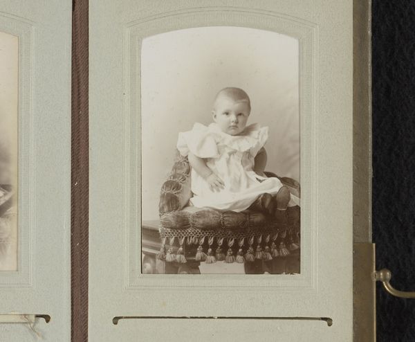 Editor: This is "Portret van een zittende peuter" by Machiel Hendricus Laddé, dated sometime between 1892 and 1906. It's currently at the Rijksmuseum. It strikes me as a very formal portrait, but there's something about the baby's expression that feels a little melancholic, maybe even defiant. What do you see in this piece? Curator: It's fascinating how this seemingly simple portrait invites such complex interpretations. The formality, as you pointed out, is typical of late 19th-century photography, reflecting societal values of decorum and the importance of family legacy. But look closer - the child isn't posed in an idealized, cherubic way, are they? The slight frown, the almost challenging gaze… Do you think that challenges conventional expectations for portraits of children during this period? Editor: Definitely! It's like the photographer captured a moment of genuine emotion, not just a posed smile. So, is the child's expression a kind of silent rebellion against those strict social norms? Curator: Perhaps. Or maybe it speaks to the complexities of childhood itself, which is rarely as innocent and carefree as we often assume. We need to consider how gender and class dynamics might influence such portraits, the pressure of respectability impacting even the youngest members of society. How does that influence your read? Editor: It definitely adds another layer. I guess I initially focused on the individual child, but thinking about those wider social forces makes the image so much richer, sadder even. I hadn't thought about that rebellion applying to childhood itself. Curator: Exactly. It’s not just about aesthetic beauty or technical skill. It is about prompting conversations about how identity, particularly for marginalized groups like children at the time, are constructed and performed. This piece provides a nuanced view of that. Editor: It's incredible how much can be unpacked from a single image. I'll never look at old photos the same way again! Curator: And hopefully you’ll now actively look for similar ways to question historical and contemporary portraits. It can be uncomfortable, but growth in understanding requires some struggle.