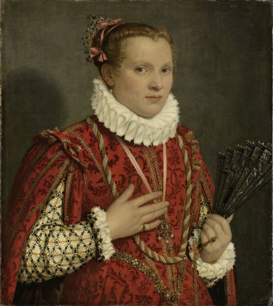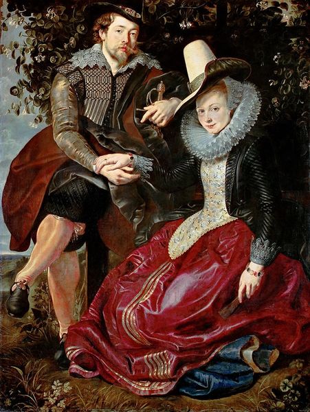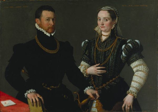 Curator: This striking image, created by Pieter (I) Pietersz around 1560-1570, is titled "Man and Woman at a Spinning Wheel." The piece is an oil painting depicting a couple, presumably during their daily lives. Editor: My first impression is of contained energy. They’re formally posed, but something in the woman's gaze and the man's subtle turn suggests tension just below the surface. It feels less like a simple portrait and more like a snapshot into a complicated relationship dynamic. Curator: That's interesting. Genre painting during this period was indeed about capturing glimpses of daily life, but often idealized to project moral or social messages. Pietersz, working within the Mannerist style, infuses this ordinary scene with an unsettling formality. The composition certainly speaks volumes; he is gazing directly into the distance and seems a bit disconnected. What narrative can be deciphered if the gender roles were shifted? Editor: The spinning wheel immediately strikes me. It positions the woman in a space of domestic labor, yes, but consider what it might symbolize more broadly. Spinning creates thread, which then weaves into fabric. Could she be metaphorically weaving the fabric of their lives? What if this is less about celebrating domestic virtue and more about highlighting the labor, both visible and invisible, that women performed within these patriarchal structures? We also have to remember that we cannot escape class and power relationships, given this period in history. Curator: I agree, absolutely. The very inclusion of genre painting as a subject worth portraying signaled shifting social values, even challenges to aristocratic norms, despite the artist very likely needing the aristocrats for economic support and social status. In the 16th century, in places like the Netherlands in particular, we see new merchant classes demanding recognition. It's all fascinating if you consider how artists themselves navigated these waters, creating imagery for both traditional patrons and this emerging bourgeoisie. Editor: Exactly! It’s through works like this that we can access a deeper understanding of the evolving power dynamics in that period. Their stiff, slightly uncomfortable posture further suggests this dance of control, maybe even the precarity of these new social arrangements. Curator: So, while on first glance one could classify the artwork simply as genre or even portraiture, your perspective really opens this up as a lens through which we can understand the nuances of social, gendered, and economic experiences of the time. Thank you for highlighting this crucial perspective! Editor: Thank you. It is often the quiet moments in art, like this, that tell the loudest stories of resistance and transformation.