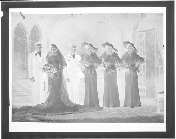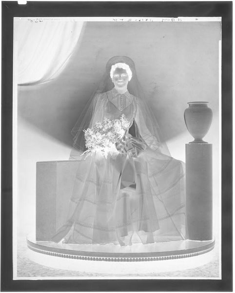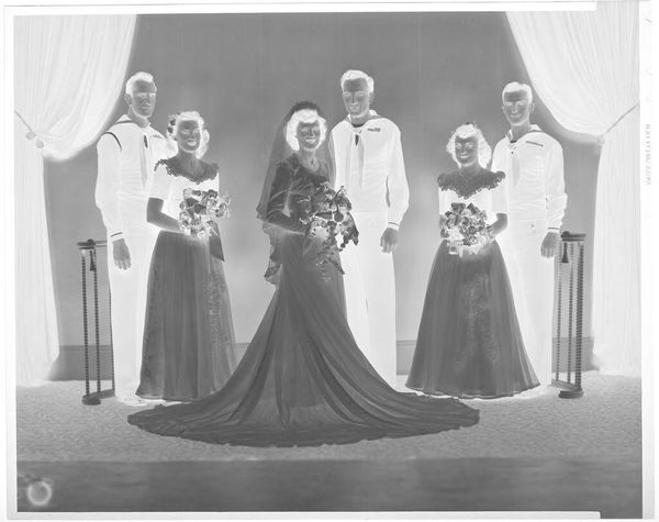 Curator: Martin Schweig's "Untitled (portrait of bride standing between two bridesmaids in front of fireplace)" presents us with a striking image, currently held in the Harvard Art Museums, measuring about 12.7 by 10.16 cm. Editor: The inverted tones and shallow depth of field create a rather ghostly, surreal atmosphere. Curator: Indeed, the composition is carefully structured, the figures arranged symmetrically. The textures, from the floral arrangements to the flowing dresses, are rich. Editor: It certainly evokes questions about the representation of women within marriage and domestic spaces. The almost ethereal quality could symbolize the loss of individuality. Curator: Perhaps. Or consider the technical aspects: the manipulation of light and shadow, the carefully considered angles. Editor: But whose gaze are we serving? Do the women have agency or are they just objects of desire? Curator: A fascinating contrast in perspectives. Editor: Precisely! It allows us to consider how social structures and artistic practices are always interwoven.