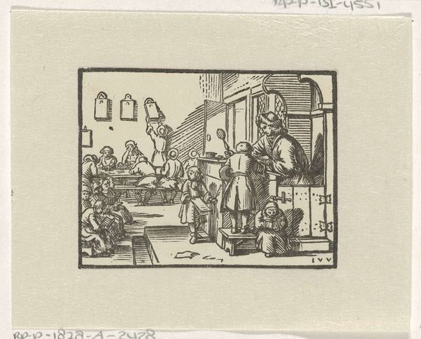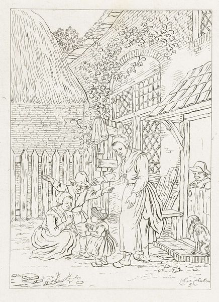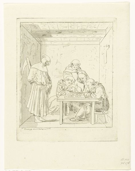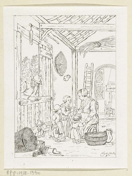 Editor: This drawing, "Gezelschap in een interieur," attributed to Nicolaas van der Worm, made sometime between 1772 and 1828, uses line work and a simple composition to depict what seems to be an interior scene with many figures. There's something so casual about the moment. What do you see in this piece? Curator: Well, the informal grouping immediately brings to mind genre painting, which offers insights into the daily life and social structures of the time. Considering that it's from the late 18th century, it’s worth asking, who is included and excluded from this ‘gezelschap’? What unspoken power dynamics might be at play? Editor: So, beyond just the scene, you are looking for social commentary? I mean, what should we pay close attention to here? Curator: Absolutely. For example, notice how the interior is rendered? What does the architectural style, along with details like the hanging birdcage and other objects, suggest about class and social status during the transition from the Dutch Golden Age toward Neoclassicism? Are these people land laborers, perhaps? Is there anything within the style that speaks to you about that time period? Editor: Hmm, that's interesting. The Neoclassical elements feel subdued, almost as if the artist is hinting at emerging aesthetic values. The line work reminds me of 17th-century Dutch Golden Age genre paintings, only simplified and less polished. Curator: Precisely! And what might this simplification represent? Perhaps a subtle shift away from opulence and towards a more "rational" worldview characteristic of the Enlightenment? How do you think art changed along with philosophy and gender dynamics in the Netherlands? Editor: It really makes me wonder how art and identity evolve together through historical change. Thank you for that interesting breakdown! Curator: My pleasure! Looking closely at these nuances is so important.
