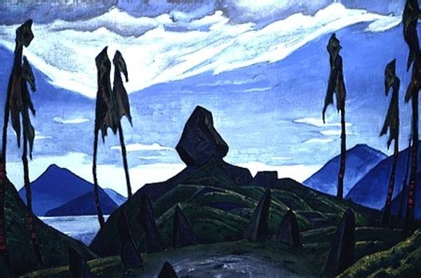 Editor: So, this is "Khan's Grave," an oil painting from 1935 by Nicholas Roerich. There’s a solitary feel to it, almost mournful, with those dark shapes silhouetted against the sky. What do you make of it? Curator: The image resonates deeply with primal symbols – the cairn, the weathered standard – each element weighted with history and loss. Think of what a grave signifies, beyond just physical remains. It represents memory, lineage, the end of a narrative. Roerich masterfully uses the landscape to amplify this feeling of quiet, enduring sorrow. Editor: The standard is intriguing – it looks almost like a tattered flag. Does that symbol carry any particular significance here? Curator: Absolutely. Flags, banners, and standards historically represent power, identity, and allegiance. In this context, the tattered banner is poignant. It speaks of lost power, perhaps a forgotten empire, reduced to a haunting echo. Consider its position relative to the sky – is it reaching for something unattainable, or surrendering to the heavens? Editor: I never thought of it that way, but now that you mention it, it does feel more like a surrender. The muted colours enhance that, I think. Curator: Yes, Roerich's choice of colour strengthens that emotive element. How do these muted colours make you feel? Editor: They almost feel… faded, like memories themselves. This painting makes you think about the passing of time, doesn’t it? Curator: Precisely. Roerich invites us to contemplate cultural memory, and the weight of history – the visual vocabulary through which humanity expresses continuity in the face of time's relentless march. What stays with you most from this image? Editor: The idea of a narrative frozen in a landscape, a whisper of a forgotten story. Curator: A fitting epitaph for a Khan's grave, wouldn't you say? A silent testament.