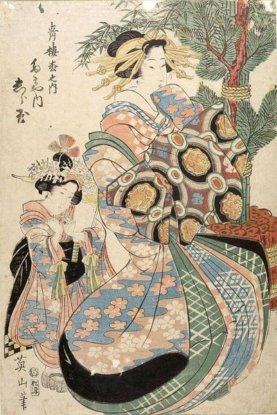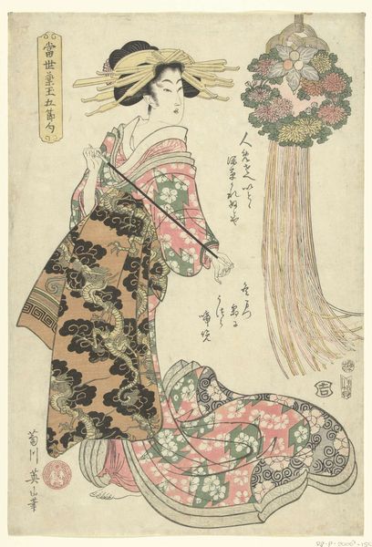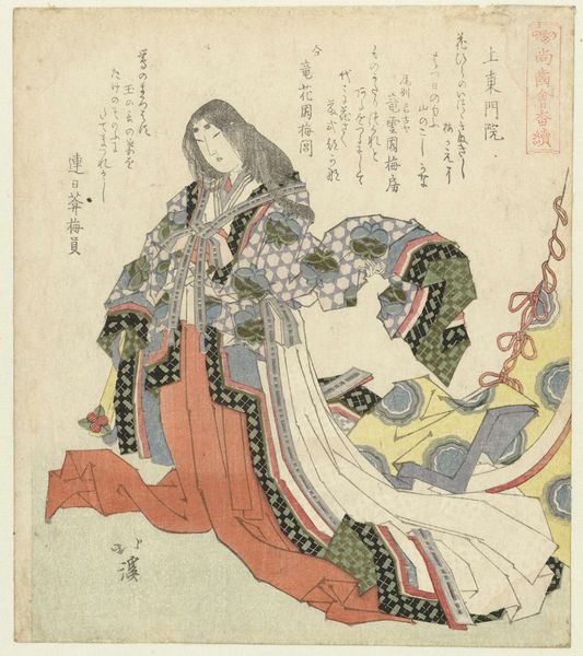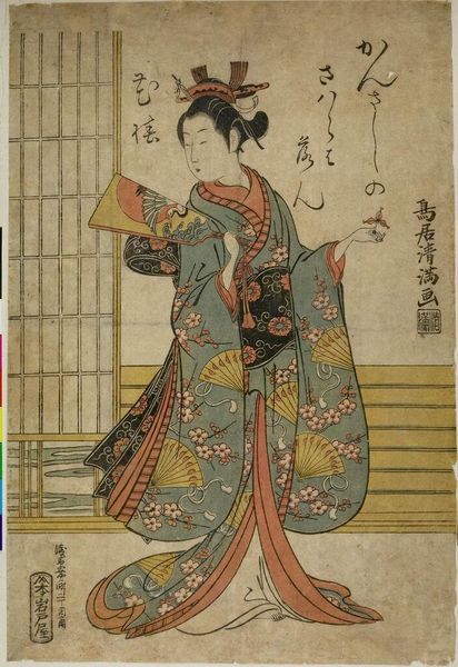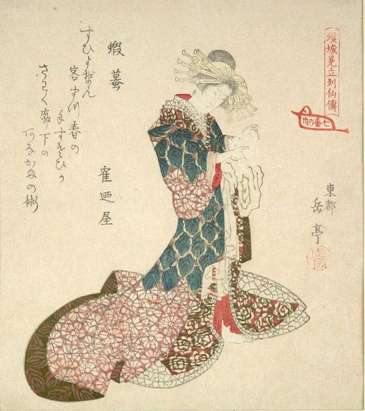 Curator: This lovely woodblock print, currently residing at the Harvard Art Museums, is attributed to Katsushika Hokusai, who was born in 1760 and died in 1849. The piece is titled "Court Lady (Ono no Komachi?) Holding Fan Behind Sliding Door, with poem by Yukinoya Torikane." Editor: It feels melancholic, somehow. The muted colors and the figure partially obscured by the door... there's a sense of isolation despite the decorative fan and rich patterns. Curator: Yes, I think Hokusai captured the complex social position of women in the court. The poem, too, likely speaks to themes of longing or perhaps unfulfilled potential. The materiality of the printmaking process, the woodblocks themselves, allowed for distribution and participation in a visual culture accessible to a broader public. Editor: It's interesting to consider how this small, intimate image circulated within the broader social and political context. It reveals a lot about taste, consumption, and the role of imagery in shaping perceptions of court life. Curator: Indeed. And it allows us to see the confluence of artistic production, literary tradition, and the material culture of Japan in the 19th century. Editor: A poignant glimpse into a world both alluring and confined.
