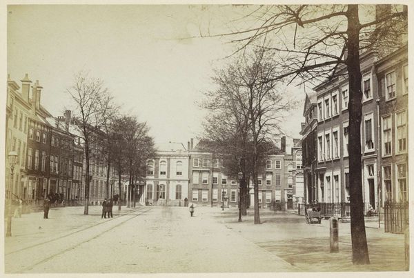 Curator: Here we have George Hendrik Breitner’s photograph, "Achterzijde van het Paleis op de Dam in Amsterdam," placing us behind the Royal Palace in Amsterdam sometime between 1886 and 1910. Breitner was known for capturing everyday life in Amsterdam, and this gelatin silver print is no exception. Editor: It’s undeniably somber. The grayscale and heavy composition create a sense of austerity, almost as if the city is holding its breath. You feel the weight of the Palace looming. Curator: Absolutely, and this image provides such a crucial visual record. Breitner’s photographs give insight into urban development and social change in Amsterdam at the end of the 19th century, during a period of significant shifts in Dutch society. Street photography documented a side of city life not typically portrayed in painting. Editor: Exactly. Think about who’s *not* in this picture. This is the rear of the Palace. There’s this back door feel—it's definitely not a celebration of royal power. The figures look rather common, their dark clothing fading in, without pomp and circumstance, the real seat of power is not really accessible for everyone, is it? Curator: That’s an interesting point. By photographing the back of the palace, Breitner arguably democratizes the image, shifting focus from official grandeur to a more workaday reality, a perspective also seen in his street scenes and depictions of working-class neighborhoods. It is really remarkable how the Palace is kind of relegated into a mere backdrop. Editor: He wasn’t afraid to present the truth of a city and that carries a sense of activism within it. It's not always beautiful and sanitized—it has these raw corners that make a city truly alive. Seeing historical images like these allows us to question our perception of our society: How do we frame our history? Who decides what is worth documenting and what isn’t? Curator: Breitner’s image encapsulates not just the architectural monument, but also captures social questions and presents a glimpse of life that official histories often ignore. Editor: Ultimately, these images confront the power dynamics present during that time. It shows that art has the power to become a tool for questioning.