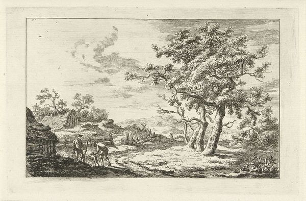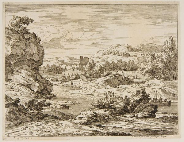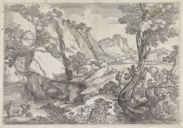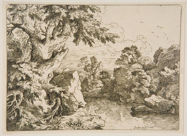 Curator: The composition evokes a sense of serene contemplation. The texture created by the engraver's meticulous hand is quite striking. Editor: It's quite lovely, actually! This is Abraham Genoels's "Landscape with a High Rock," currently residing at the Harvard Art Museums. There's no specific date attached to it. Curator: Observe how Genoels employs a limited tonal range, relying on line weight and density to define form. The light source is ambiguous, creating a flattened effect across the scene. Editor: I find myself thinking about the tradition of the Grand Tour, and how these idealized landscapes shaped European perceptions of the natural world and the role of art in shaping those perceptions. Curator: Indeed, and note the almost geometric structure implicit in the rock formation. It serves as a potent anchor within the composition. Editor: So, while the landscape is naturalistic, there is a clear emphasis on the sublime quality. It's all very impressive. Curator: Precisely. It encourages a formalist reading of space and depth. Editor: Well, this piece leaves me pondering how these seemingly straightforward representations served much broader cultural functions. Curator: A truly rewarding exploration, indeed.