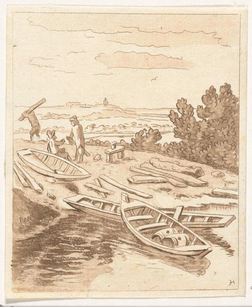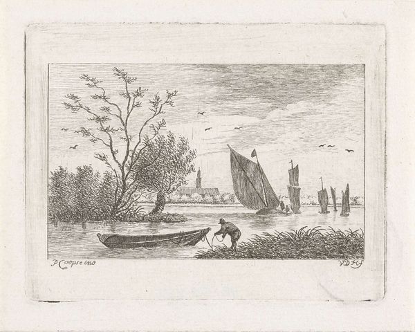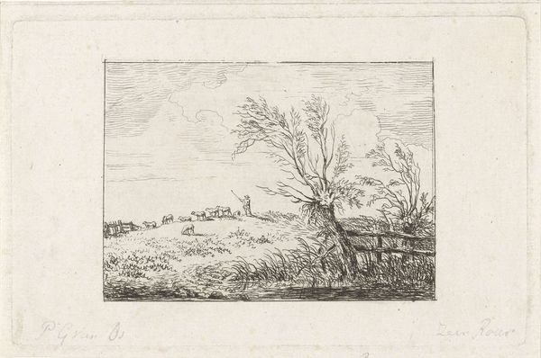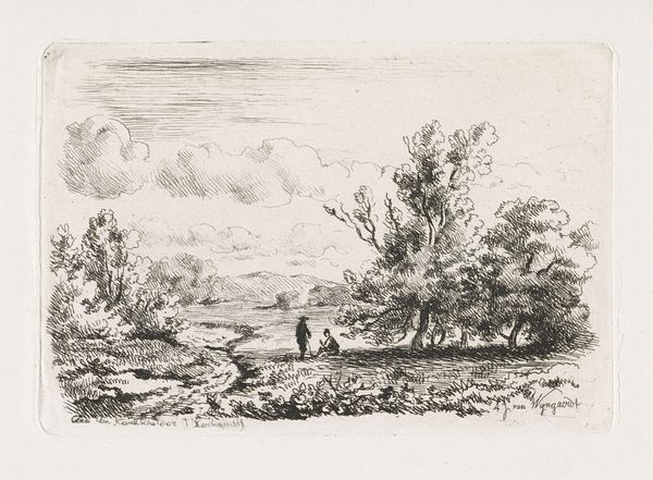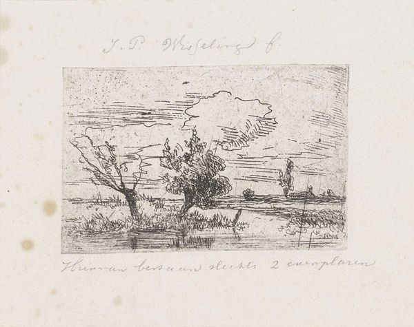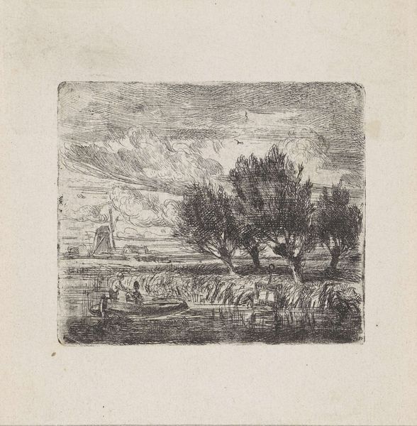 This etching, "Knotwilgen aan de waterkant", was created by Augustinus Jacobus Bernardus Wouters. It features pollard willows that stand along the water's edge. These trees, with their repeatedly lopped branches, are potent symbols of cultivation and human intervention in nature. Consider the cyclical nature of pollarding: cutting back to encourage new growth. It’s a dialogue between humanity and nature, echoing ancient agricultural practices. The act of pruning and managing trees is an act of cultural memory. The willows, repeatedly reshaped, mirror similar motifs found in ancient tree worship and fertility rituals across cultures. In these traditions, trees symbolize life, death, and regeneration. The enduring image of the pollard willow connects us to the past, revealing how we continuously reshape and are reshaped by the natural world.