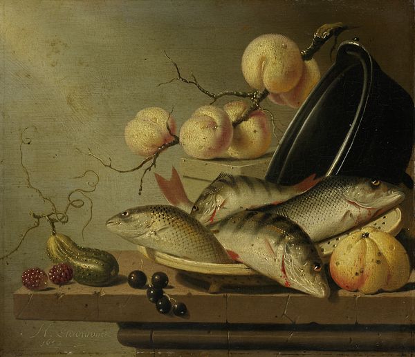 Editor: Here we have Abraham van Beyeren's "Still Life with Fish," likely painted sometime between 1650 and 1670. The use of oil on canvas gives it a rich, almost tactile quality. There's a somberness to the composition that's both intriguing and slightly unsettling. How do you read this painting? Curator: That somberness is a great starting point. These Dutch Golden Age still lifes, while seemingly just depictions of food, are so much more. Consider the historical context: the rise of Dutch maritime power and the expansion of global trade. Fish wasn't just food; it was a commodity, a symbol of prosperity built on potentially exploitative economic systems and the subjugation of the environment. Editor: Exploitative how? I guess I hadn’t really thought of the economic side of the piece before. Curator: Well, who benefits from this bounty? The painting highlights the availability of these resources, but it also subtly acknowledges the labor and systems required to bring them to the table. Consider ideas of access, both in Van Beyeren's time, and our own, related to food and environmental justice. Editor: So, the painting becomes a statement, or at least raises questions about the ethics of consumption. Curator: Precisely. And think about the 'vanitas' tradition in still life—these images also acted as memento mori, reminders of mortality. The fish, already caught and prepared, highlights the transience of life, a meditation on our place in the natural order but also how resources may or may not last. It also poses questions such as who got access to it and who didn't, since they are not eternal. Do you see the visual language of privilege and possible over-exploitation now? Editor: Definitely! I initially saw only the surface, but understanding the historical and social implications adds a whole new layer. I now read this artwork with a completely new understanding of its implications and the history surrounding the painter and the work of art itself. Curator: Indeed. This is the power of art history. We can engage in critical dialogues and explore social injustices, economic inequalities, environmental and intersectional injustices and more. It also leads to the deeper, critical questions we must pose now.