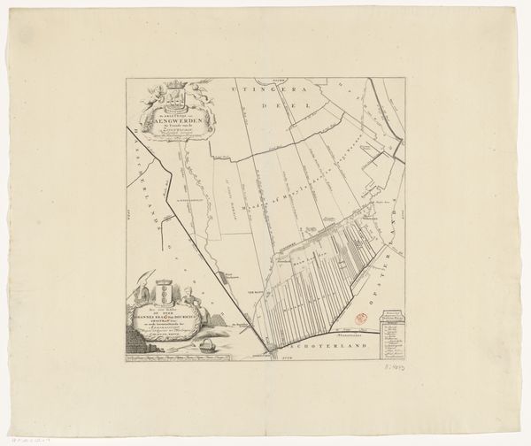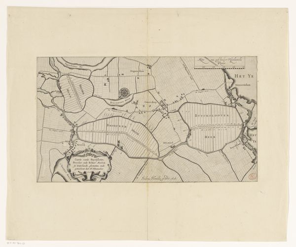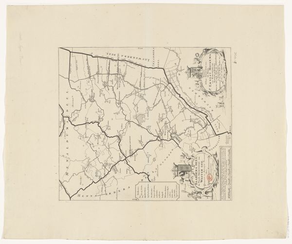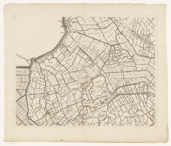 Curator: So, here we have "Kaart van Kennemerland en West-Friesland," created around 1680 by Coenraet Decker. It's part of a series of regional maps and manifests itself as a detailed engraving in ink. Quite something, isn't it? Editor: Immediately, I'm struck by the intricacy and the level of precision. It feels very ordered, almost clinical, yet also a little dreamlike, as if seen through a dusty pane of glass. A structured kind of nostalgia, perhaps? Curator: I find your sense of nostalgia particularly interesting given the context. These maps, especially during the Dutch Golden Age, represented control and understanding, really quite a bold claiming of space through line and lettering. Editor: True! But look closer; there's an underlying rhythm in how the land is divided, those rectilinear shapes. They’re balanced by the fluid lines of the waterways and coastline, creating a constant visual dialogue. And notice that tiny compass rose placed there—it's not just functional, it gives the piece a certain elegance. Curator: I hadn't considered it elegant, per se. However, I do see it as incredibly demonstrative of the era's focus on empirical observation meeting burgeoning trade. This isn't just pretty—it's powerful information packaged for navigation and dominion. Editor: Precisely. What fascinates me is that, though factual, the artist’s hand infuses this with personality. Look at the quality of line—it’s confident but never rigid, allowing light to flow through, and the water details are beautifully rendered, making them appear almost animated! Curator: Agreed. There is an artistic spirit underlying the apparent practicality of it all, especially as it moves through generations as not only data, but artifact. What stories lie beneath the surface now! Editor: Definitely, so while the modern viewer might immediately classify this image as strictly cartographic, it transcends that label with elements of narrative intrigue—it’s a visual document hinting at myriad other invisible dimensions. And like a well-composed song, it leaves one wondering how to decipher the unwritten verses. Curator: Perfectly put!