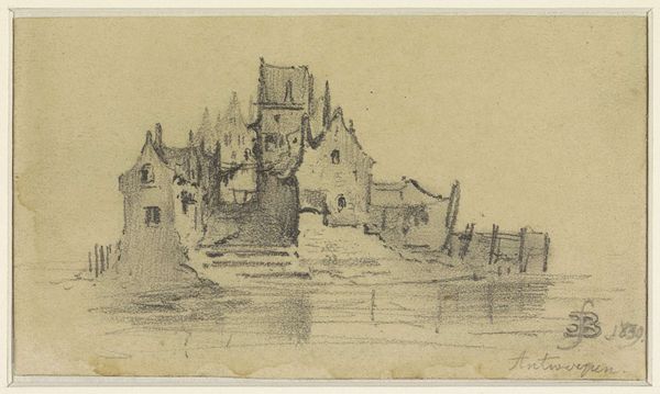 Editor: This is "Gezicht op de Butte: de molens," a pencil drawing by Georges Michel, dating from around 1773 to 1843. It’s a fairly simple sketch, but I find the composition really compelling—almost like a stage setting with these windmills placed prominently. What do you see in this piece from a more formal perspective? Curator: Indeed, the artist’s handling of line and form is quite striking. Notice how the receding plane is established primarily through changes in the density and texture of the pencil work rather than traditional perspectival techniques. The windmills are rendered with comparatively darker, thicker lines, establishing them as a focal point against the fainter, almost atmospheric depiction of the land and distant structures. Do you perceive a structural relationship between the windmills and the other shapes within the composition? Editor: I see the relationship. The heavier lines create the foreground, pushing back the less defined buildings in the background, emphasizing the depth and drawing the eye to the windmills first. The buildings seem to echo the basic shape of the windmills but in a diminished way, as if the windmills are a stronger, closer version of them. Curator: Precisely. Also, consider how the limited tonal range impacts the overall mood. The soft grays evoke a sense of quietude. There's also a textural dialogue between the rough, almost haphazard strokes depicting the landscape, and the more deliberate rendering of the architectural forms. The subtle use of the medium invites prolonged visual contemplation. Do you notice how the artist uses the empty space as part of the piece? Editor: Now that you mention it, the empty space creates a feeling of vastness despite the drawing's small scale, and emphasizes the stark silhouette of the structures on the horizon. That emptiness helps direct your attention to the details present. I really like that it makes the windmills more pronounced. Curator: The interplay between presence and absence within the pictorial space generates a powerful tension that I find captivating. Editor: I see that, and the concentration on lines as form and depth helped me appreciate the artist’s ability.