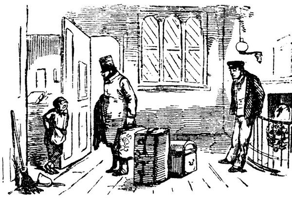 Curator: John Leech's "The Level Crossing" presents us with an intriguing scene. The medium used seems to be ink drawing. What is your first take, Editor? Editor: Stark, like an etching. The high contrast accentuates the formality of the subjects, doesn't it? They seem almost trapped in their postures. Curator: The technique really does emphasize lines—notice how Leech employs varied linework to give texture to the clothing. It almost creates different material qualities within this limited monochrome palette. There’s the soft fur trim against what looks like a sturdy woolen coat. Editor: Right. That fur immediately strikes me as a symbol of status, drawing the eye to the figures of authority—particularly that older woman. Notice how the composition places her and her companion almost as gatekeepers. Even the dog looks severe, like some kind of heraldic creature. Curator: An excellent point. It appears the whole social order of Victorian England, including its animal counterparts, is intricately documented. Editor: Yes. Look closely: Even the background, bare trees and what appears to be a gate, all subtly echo the rigidity of the social tableau in the foreground. It reinforces this notion of an inflexible structure. Curator: It is a wonderful example of narrative art; seemingly a fleeting scene of everyday life, it hints at a bigger picture of social constructs, economic forces, even labor and production as symbolized in their garb. Editor: For me, it is how skillfully the composition leads us to ponder themes like privilege, and tradition and class. Leech invites the viewer to reflect on a very specific era. Curator: Definitely. And in such deft strokes! Editor: Yes. This artwork lingers in the mind well after the lines fade to grey.