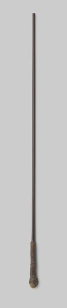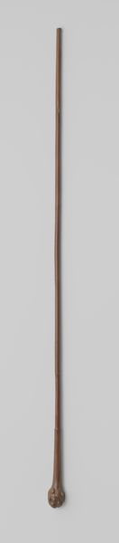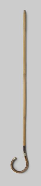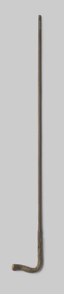 Curator: I’m struck by the utilitarian elegance of this object. It’s described as "Onderstok van een paraplu of parasol van zwart geverfd hout met een gekromde haak, voorzien van twee zilverkleurige metalen ringen," dating from about 1920 to 1940. Editor: Immediately, it evokes a sense of lost glamour. The polished wood and subtle metal details speak of a bygone era of formal dress and social rituals dictated by weather. There’s almost a sad beauty in its solitary presentation. Curator: Exactly. While seemingly humble, this umbrella handle offers insights into the processes and social meanings embedded in everyday objects. Black painted wood, with metal elements: it blends natural material with industrial finishing techniques characteristic of its time. Who crafted this, under what labor conditions? The details of its manufacture matter. Editor: Absolutely. Think about the role of the umbrella itself in shaping social interactions. The visual language of parasols signalling status, creating personal space in crowded cities. Its function dictated movements, social protocols of use and carriage. These considerations bring the object out of static display. Curator: I agree. Also consider the social role of the Rijksmuseum itself, where we stand today. What does it mean for a functional object like this—a piece of, essentially, consumer technology—to enter the museum's collection and gain recognition alongside traditionally valued art forms? It complicates hierarchies between art and artifact. Editor: Museums elevate certain objects, thus assigning new significance. A broken umbrella stand. Once tossed away as refuse. Recontextualized within these halls it compels narratives that mirror shifts in industrialization and even artistic valuation. It has power still. Curator: In the end, understanding the layers—materials, manufacture, function, museological framing—allows us appreciate everyday items in ways which shed insight on society that produced it and institutions charged to preserve memories embodied within. Editor: A reminder to look beyond accepted masterpieces for hidden value and meaning. Ordinary, when understood socially, is actually exceptional.