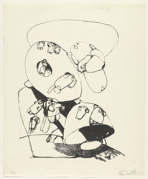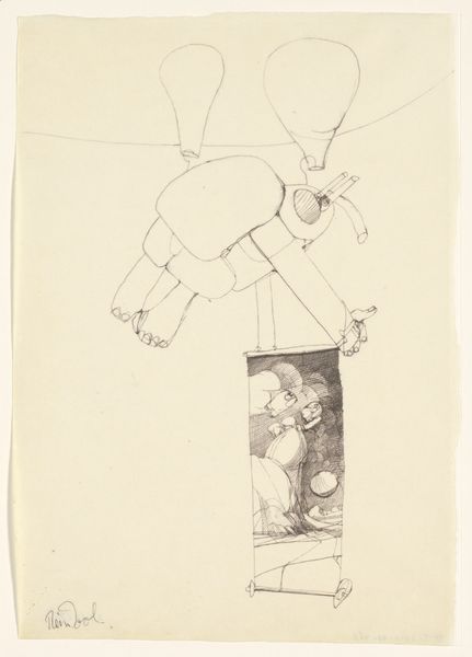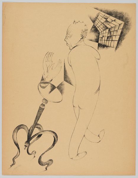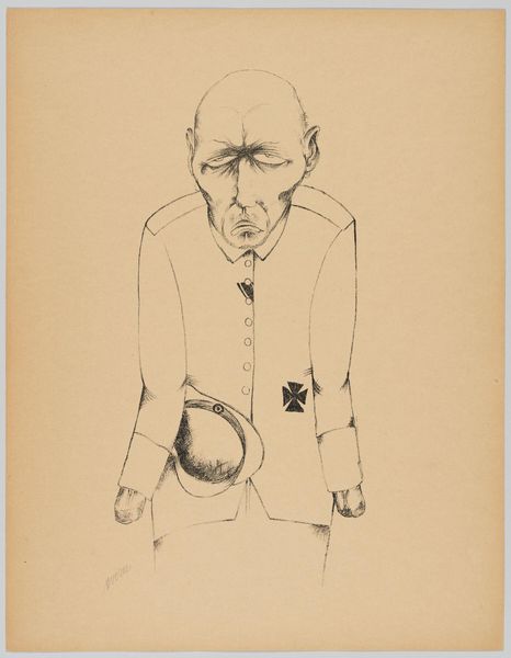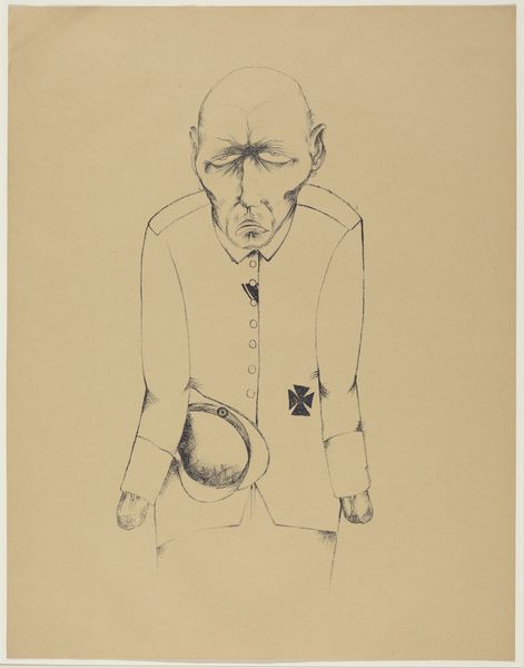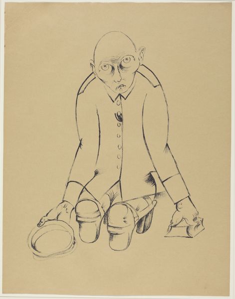 Editor: Here we have Heinrich Hoerle's stark drawing, "The Breadwinner." It's a simple sketch, but there's something deeply unsettling about the figure's expression and posture. What do you see in this piece, beyond the immediate impression? Curator: This image screams interwar Germany. Hoerle's work often critiques social inequality and the dehumanizing effects of industrialization. The man's exaggerated features, the tools of labor – these speak to the period’s anxieties around class and the individual's struggle for survival. What kind of power dynamics are at play here, do you think? Editor: So, you’re suggesting it's a commentary on the working class, perhaps their exploitation? It's hard to ignore that his eyes stare straight at the viewer, as if to directly ask you to understand his predicament. Curator: Exactly. And understanding Hoerle’s involvement with the Cologne Progressives, a group of politically engaged artists, reinforces this reading. This image can spark dialogue about the intersections of labor, identity, and the artist's role in bearing witness. Editor: I never considered the connection to his collective. It's fascinating how much context shapes our understanding. Curator: Indeed. Art like this challenges us to look beyond the surface and consider the deeper social and political currents at play.
