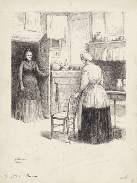 Alfred Ronner created "Dientje's Wedding" using pen and ink on paper. This isn't fine art in the traditional sense, but rather a glimpse into everyday life, carefully rendered with accessible materials. The fineness of the lines allows Ronner to capture the texture of the women's dresses, the rough brickwork of the hearth, and the gleam of the metal pails. The artist has engaged with the traditions of drawing to give the work social and cultural significance, highlighting the amount of work involved in the production process. Look at how the controlled mark-making contrasts with the scene depicted; the labor is not romanticized. Ronner seems to be interested in the contrast between the refined process of drawing and the everyday work involved in the wedding. Paying close attention to materials, making, and context allows us to understand the full meaning of an artwork like this, challenging traditional distinctions between fine art and craft.