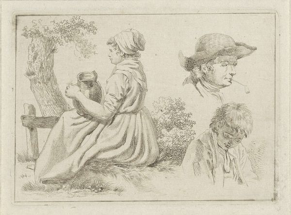 Curator: I'm struck by the quiet intimacy captured in this pencil drawing by Johan Christiaan Willem Safft, titled "Zittende vrouw met schenkkan, portret van een man met pijp en een jongen". It was created sometime between 1788 and 1849. Editor: There’s a definite sense of melancholic simplicity. The use of pencil really lends itself to the everyday, a mundane quality underscored by the presentation of what looks like ordinary people caught in quotidian moments. Curator: Absolutely. Let's look at the materiality – the very use of pencil suggests a certain accessibility, both for the artist and, potentially, in representing the lives of working people. Safft’s choice downplays grandeur, favoring a straightforward mode of production, emphasizing the manual labor inherent in creating art. The drawing style focuses more on capturing raw human forms than on idealization, hinting at the real socio-economic circumstances of the sitters, and possibly speaks to shifting power dynamics within portraiture during the period. Editor: It is difficult not to see their working-class existence subtly highlighted. Take, for instance, the woman with the jug. Notice how her pose—slightly hunched, focused solely on her work—speaks volumes about the role and the labor, literally, that women played in 18th and 19th-century society. I find the visual placement alongside the two male figures really underlines potential imbalances in social hierarchies, gendered labor, and possibly even ageism through the figure of the boy with a similar disposition. Curator: I agree; considering Safft's historical positioning, his method becomes an explicit choice to democratize representation through the act of drawing itself. Pencil was, comparatively speaking, readily available. I feel his decision serves as a deliberate commentary on class and artistic production. It rejects opulence for raw, honest representation. Editor: It feels very subversive considering the art market at that time was largely for an exclusive audience. Thinking about it, one might even read a sense of gentle activism into how Safft frames the ordinary, pushing the everyday experiences of different genders and age groups to the forefront. This piece sparks many important discussions! Curator: Agreed. Seeing this drawing gives insights into not only past material constraints and artistic decisions, but offers avenues for broader examination of art’s relationship to culture. Editor: For me, looking through a lens that acknowledges intersectional themes gives fresh perspective to otherwise seemingly 'simple' or genre drawings. They truly can act as historical agents, providing windows into identity and the societal complexities of the era.