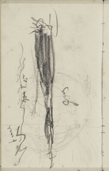 Curator: This quick pencil drawing is titled "Boten", dating back to 1912, part of George Hendrik Breitner's sketchbook. What's your initial take? Editor: It's raw, a fleeting impression captured with minimal strokes. I immediately notice the linear quality; the forms are almost architectural, like a structure built from simple lines. There's a real economy of means. Curator: Breitner was known for capturing the everyday life of Amsterdam, and these sketches provide invaluable insights into his process. Consider the accessibility of the materials - a simple sketchbook and pencil, tools available to almost anyone wanting to record their surroundings. Editor: Exactly. Looking closely, one can see how the hatch marks define shadow and volume, and I suspect that the notes scrawled near the image are color notes, a direct record of observed reality. Semiotically speaking, they anchor the abstraction of the lines to tangible things in the world. Curator: These personal sketchbooks challenge our typical idea of a finished artwork, shifting the focus toward the means of production. We're getting to observe Breitner's working method - how he explores compositions and figures prior to embarking on a painting. This shows us how the idea developed over time through different sketches and how it finally took shape. Editor: The page itself functions as a field of experimentation. It reminds us that artworks are created through the work of labor and they represent the ideas being conveyed by the artist and experienced by the spectator through visual cues such as lines, structure, colour, or shape Curator: Viewing this drawing in the Rijksmuseum today provides a window into a specific historical context. We can examine how Breitner engaged with his environment. It makes you reflect on the way ordinary objects of past periods of time are made and preserved across different contexts. Editor: The directness appeals to me. We are viewing, quite simply, a visual document—the architecture is interesting and gives us the structure with form and meaning. There is a kind of balance in the distribution of all those lines on the support that keeps us looking and exploring every little segment with precision and order. Curator: Agreed, there's something immediate about encountering an artist's initial thought. A glimpse into the gears turning, so to speak. Editor: Precisely. It’s in these direct observations, these formal arrangements, that art transcends mere utility and speaks to something deeper.