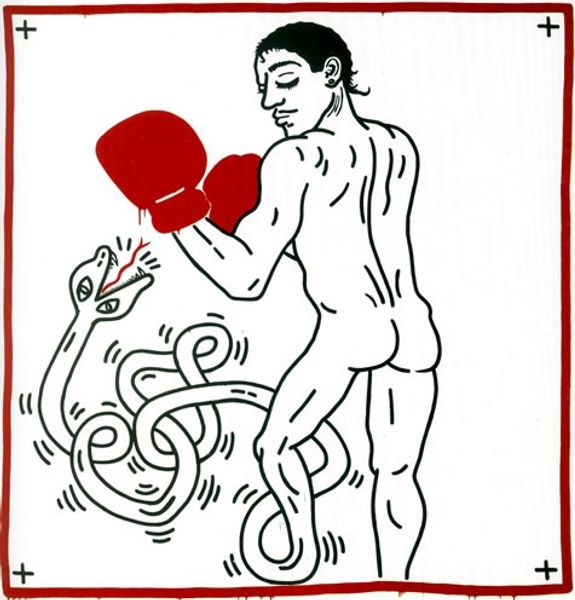 Curator: Just look at this, 'Safe Sex', completed by Keith Haring in 1988. It's mixed media, incorporating both acrylic paint and graphic art techniques, really striking. Editor: The high-contrast palette definitely grabs you. There's something urgent, even playful about it despite the serious undertones, but something sinister too. I am especially taken by the bodies' patterning against that hard black ground, also the Xs where we expect the faces to be. Curator: Indeed. It was produced during the height of the AIDS crisis, and we must view it as direct socio-political commentary. The composition itself, these figures linked arm in arm, points to community, to mutual support but also to the risk associated with intimacy. Editor: That black backdrop makes me think of the silence, or perhaps denial, surrounding the crisis back then. Haring consistently challenged those silences. And isn't it powerful how he merges personal and political expression? Sexuality, fear, desire... it's all here, distilled into these graphic forms. Are those Xs symbols for cancelling death, even oblivion? Curator: Perhaps. What’s crucial to acknowledge is the agency given to the figures. They appear animated, powerful even, suggesting an ability to protect oneself, underscored by the 'thumbs up', in contrast to the fear so prevelant at the time. The figures assert themself, their sexuality is potent and in control, a striking departure from a societal norm in those dark years. Editor: Agreed. This image doesn't preach, it empowers. Haring gave a visual vocabulary to an entire generation facing profound anxiety and loss. Curator: In revisiting the work of Haring today, there are complex layers relating to visibility and self determination to unpack. It makes you contemplate where we were, where we are and where we are going as a society. Editor: Absolutely. It still speaks volumes, doesn't it? Its messages are as alive now as when Haring first put paint to canvas, perhaps even more so.