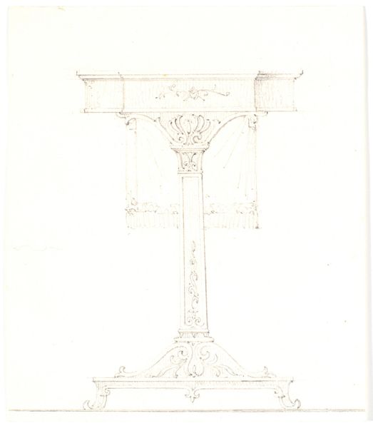 Editor: This is a drawing titled "Finial," and attributed to Karl Ballenberger. It’s a pencil sketch on toned paper, seemingly of an architectural element. There's something very precise and technical about the linework, almost like a blueprint. What strikes you most about the piece? Curator: It's intriguing to consider the process itself. We see the trace of the artist's hand, the graphite leaving its mark on the paper. Was this a preparatory sketch, meant to guide a craftsman in the creation of an actual finial, perhaps in stone or metal? Consider the social context – the division of labor between designer and maker. Editor: So, it's not just the image, but what the image represents in terms of production? Curator: Precisely! Think about the hierarchies embedded within the art world and architectural trades of the 19th century, the way “high art” often overshadows the skilled labor involved in creating functional or decorative objects. The "ornament" here, according to the metadata, might be considered less important than a history painting. Why is that? Where was this finial going to be? Editor: I hadn’t thought about that division. So you are wondering, if it wasn't "high art", how the materials informed function, which then spoke to social context? It wasn't created in a vacuum. Curator: Exactly. The type of stone, the metal, even the pigments if it was painted—these choices reflect not just aesthetic preferences but economic realities and social values. What was Ballenberger trying to show about material wealth? Editor: I see that now. It makes me wonder about the intended audience, too. Someone had to be able to read and interpret this drawing. Curator: Indeed. We're looking at more than just an object; we're looking at a record of production, consumption, and social stratification, materialized in this simple drawing. It invites questions about how art reflects and shapes the world around it, questioning high and low culture, design and ornament. Editor: That's given me a completely new perspective. I was so focused on the image itself, I didn’t think about the layers of context embedded in its creation and use. Curator: Material concerns and an approach focused on class open the drawing up far more than the pretty sketch that it seems. It suggests further social questions we need to continue to discuss in museum curation.