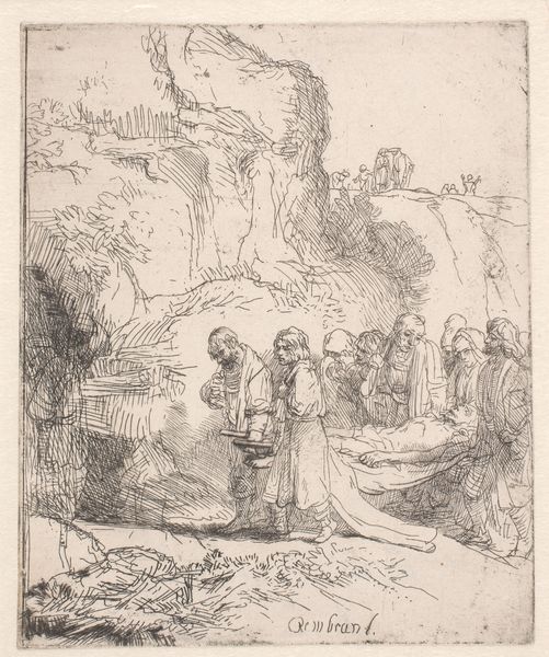Rembrandt van Rijn created this etching, “Christ returning from the Temple with his parents," using lines to create a sense of movement. Notice the visual balance achieved through a dynamic interplay of light and shadow that carves out form and space. Rembrandt masterfully guides our eyes through the composition, from the figures in the foreground to the bustling background, using intricate line work. The etching technique allowed the artist to build depth and texture, evoking a sense of the sacred journey. Rembrandt's profound engagement with light, a hallmark of his style, transforms the narrative into a deeply moving experience. How do the lines and the contrast between light and shadow lead you through the etching?