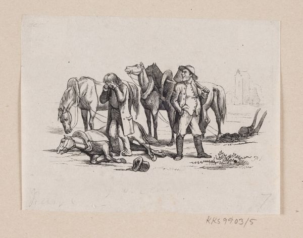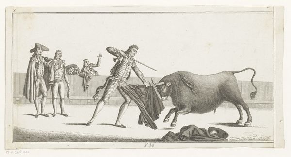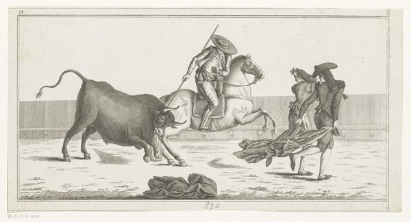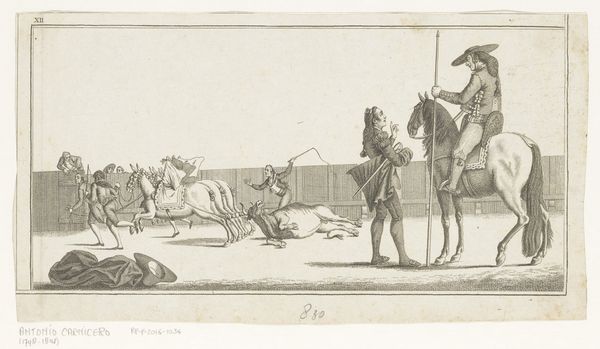 This print, titled "Picador van zijn paard gevallen", captures a dramatic moment in a bullfight, rendered by an anonymous artist. Bullfighting is a spectacle deeply entwined with Spanish identity, tradition, and masculinity, though it’s also fraught with ethical concerns around animal cruelty. Here, we see the picador – the bullfighter on horseback – unseated and in danger. Consider the power dynamics at play. The bull, a symbol of untamed nature, versus the matador, representing human dominance. The horse is often overlooked, yet it's integral to the spectacle, bearing the brunt of the bull's force. The picador's fall disrupts the expected order, revealing vulnerability and challenging the narrative of control. Are we meant to empathize with the fallen rider, or does the scene provoke a different response? Ultimately, this image leaves us contemplating the complexities of cultural rituals, the fine line between tradition and cruelty, and the ever-shifting balance of power.