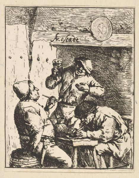 Curator: Here we have Adriaen van Ostade's etching, "Singer Standing Between Two Smokers," likely created between 1610 and 1685. What's your first impression? Editor: There's a distinct murkiness to it – a sense of cramped, smoky interiors and probably loud, drunken conviviality. The figures are packed into a small space. Curator: Ostade was a master of capturing everyday life in the Dutch Golden Age, especially the tavern scene. Note how the artist organizes the composition into a pyramidal arrangement, with the singer forming the apex and the two smokers grounding the base, unifying foreground and background through carefully balanced tones. Editor: But what does it signify? Taverns weren’t simply places for merriment. They were central to social structures, often sites of negotiation, exchange, and, crucially, exclusion. Look at the social status implied in the attire; these aren't wealthy merchants, but likely laborers escaping the daily grind. Curator: Indeed. But consider how Ostade deploys chiaroscuro—that is, strong contrasts between light and dark—to create dramatic effect and guide the eye. It is especially potent, almost theatrical, but the focus is, in the purest sense, painterly: how light falls, textures contrast, forms combine. Editor: It is theatrical, in a deliberately political way. These dimly lit interiors offered refuge, but they also reflect a broader historical reality, from limited opportunity and a rigid class structure. I also wonder, does the singer unite or disrupt the status quo with his performance? And who has access to his songs? Curator: Such cultural details do matter, yet consider the pure aesthetic enjoyment—the composition's formal elegance—independent of our interest in narrative and symbolism. Van Ostade clearly possesses a masterful command of line. Editor: Fair enough. The linear intricacies enhance both the artwork's technical skill, and it's rich context, simultaneously offering insight into the characters and life during this historical period. Curator: By engaging with art on this level, perhaps we glimpse at the beauty of its historical nuances, appreciating van Ostade's enduring power as a formal exercise. Editor: And through social context and lived experience, that enriches a deeper discussion about accessibility, social boundaries, and what it meant to belong – or not – in that Dutch Golden Age world.