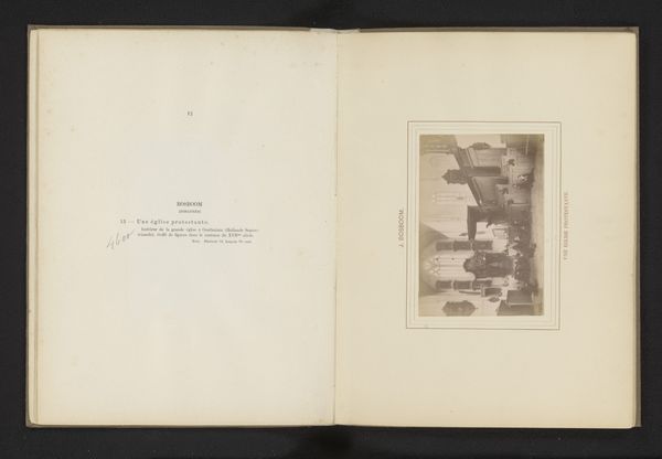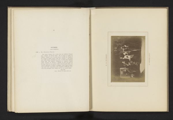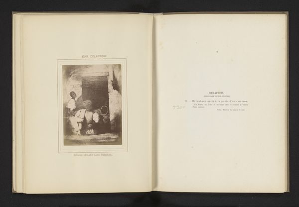 Curator: This photogravure presents a reproduction of Rosa Bonheur’s “Chien de berger”, dating from before 1883. I am struck immediately by the interplay of textures, the roughness of the landscape in stark contrast with the softness of the dog's fur. Editor: It’s presented like an artifact—an image reproduced, almost aged. Look at the quality of the paper—clearly not some mass-produced item. It feels intimate, as though handled and loved. Is this perhaps a photographer reproducing the original? Curator: Yes, quite possibly, it shifts our understanding. It’s a work mediating a work. Notice the careful framing—both of the depicted painting and within the book itself. This doubling calls attention to the constructed nature of representation, hierarchies of value even. The composition, while seemingly straightforward, contains levels of artifice and choices about presentation. Editor: Right. The means of reproducing and consuming images like Bonheur’s are central. Who would own such a thing, and what did owning it represent? I'm particularly curious about the publication process. Did Bonheur have a role? Who produced this photogravure and how was it distributed? That's really the hidden subject of this piece. Curator: Indeed, the materiality—the paper stock, the inks used— speak volumes about intended audience and purpose. We must also consider Bonheur's artistic project overall, celebrating the inherent beauty of the natural world with almost scientific precision. How this reproduction served—or potentially altered—that project. Editor: Ultimately, this single leaf tells a far richer story than the depicted shepherd dog, inviting us to reflect on the changing nature of art’s value, materiality and its circulation within a specific society. It's a conversation between layers of artistry. Curator: Precisely, each artistic choice amplifies not just an aesthetic appeal, but prompts considerations regarding production, representation, and worth within the visual landscape. Editor: Agreed. A humble, material, document becoming something much greater.