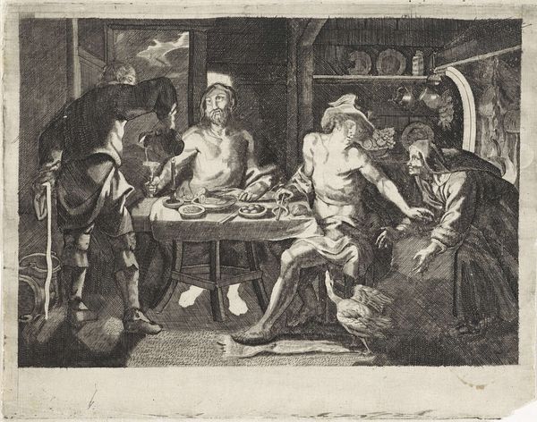 Curator: Here we have "Jupiter en Mercurius in het huis van Philemon en Baucis," a print created sometime between 1586 and 1660 by Cornelis Galle I, held here at the Rijksmuseum. Editor: Wow, it’s striking how much it looks like a stage play, all chiaroscuro and heightened drama. There’s a distinct air of "something wicked this way comes," but rendered in such delicate detail with the engraving. It feels eerie, yet domestic. Curator: Precisely. The work captures a scene from Ovid's "Metamorphoses." Jupiter and Mercury, disguised as mortals, seek shelter and hospitality. Only the elderly Philemon and Baucis offer them refuge, unaware of their guests' true identities. Editor: It's fascinating how Galle portrays these gods – there's none of the expected godly grandeur, right? They look almost vulnerable. That lean physique of Mercurius hints at a tough road; a touch of humanity and humility makes the encounter all the more intimate. Curator: The narrative served a clear social function at the time, reflecting the crucial virtues of hospitality and piety within communities. To turn away a stranger, the print suggests, is to risk offending the divine, with consequences rippling through society. Editor: And what a dynamic rendering! That poor goose trying to flee adds a wonderfully chaotic note of tension. I like to think about why it's the goose they want to sacrifice for the gods. Is it because they're common creatures, readily available, or are they supposed to hold certain symbolic meanings for the Gods, hmmm. Curator: Well, within a historical context, animal sacrifice was standard for veneration in rituals. Moreover, you have to wonder whether the scene's setting, rich in detail and seemingly insignificant domestic paraphernalia, emphasizes how exceptional Philemon's and Baucis’s hospitality really was. Editor: You’re right. It feels as if we've caught them mid-story, that transformative moment where the mundane is about to collide with the mythic, wouldn't you agree? I enjoy seeing my perspective expand like this, discovering how art and stories shape culture. Curator: And discovering new vantage points, for this episode, enriches one's own narrative, I believe.
