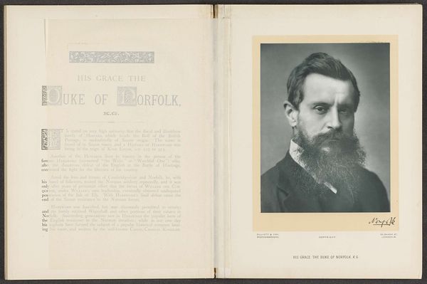Editor: Here we have a print, a gelatin-silver print to be precise, titled "Portret van Frank C. Burnand," created before 1883 by The St. James's Photographic Company. I'm immediately struck by the formality, the seriousness etched into Burnand's face… quite a character, really! What's your take on this piece? Curator: It’s curious how photography, then, even more so, strived for a painterly gravitas, isn't it? Look at the dramatic lighting, the way his beard is meticulously groomed. There's a theatricality hinted at, perhaps reflecting Burnand’s connection to "The Theatre" as stated in the print's inscription. Notice the faint inscription below the portrait–do you find it adds an intimate note or perhaps it's self-aggrandizing? Editor: Intimate, definitely! It's like a little secret the image is sharing, humanizing Burnand. What strikes me, though, is the lack of context; I wonder what was going through Burnand’s mind while the photograph was being taken. Curator: Ah, the eternal question. Perhaps he was contemplating the next editorial meeting? We can't truly know his immediate thoughts, but we can use our imagination! We see a well-to-do gentleman of the Victorian era, likely successful and proud, immortalized with some sepia tone! He is now preserved, or should I say 'canned', as Sontag cleverly remarked! What feelings does that bring up in you, reflecting on that "capture" from the 19th Century, with what you know of 21st Century life? Editor: It feels very static, doesn't it? Yet strangely compelling... like a portal! Curator: Exactly! Art often surprises you, inviting you into its peculiar world. I like to see if something ancient speaks to me; sometimes the past grabs my hand and pulls me along on a fascinating ride!