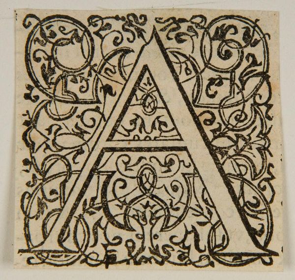 Curator: This print, titled "Initial A" by an anonymous artist, features an elaborate letterform. It's held in the Harvard Art Museums collection. Editor: Oh, it's so delightfully overgrown! Like a letter that's decided to sprout vines and take root. Curator: Indeed! The letter A is embedded within a flourish of leaves and what appears to be a grotesque head at the base. Perhaps a symbol of growth intertwined with mortality? Editor: I love that, the dance between life and decay, all wrapped up in the most fundamental building block of language. It makes you wonder, doesn’t it, about all the hidden narratives lurking in plain sight? Curator: Absolutely. It reminds us how even the simplest forms carry layers of cultural memory and hidden meanings. Editor: Gives you pause before you casually type an "A," doesn't it? I'll never look at Helvetica the same way again.