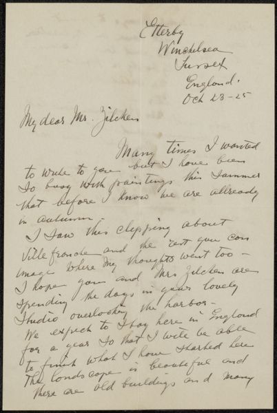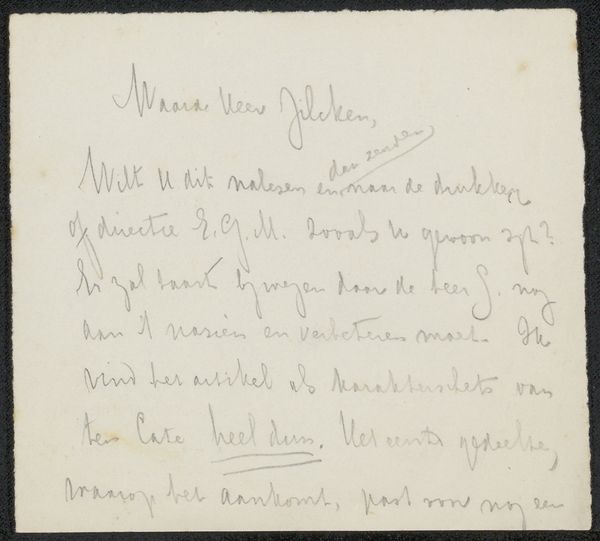 Curator: This work, "Briefkaart aan Philip Zilcken" which translates to Postcard to Philip Zilcken, is a drawing done by Jan Hoynck van Papendrecht, likely between 1911 and 1931, using pen and ink on paper. The script is flowing, with varying line weights. It seems more a study of hand-lettering. Editor: My initial impression is of controlled chaos. The handwriting is dense and energetic, yet the overall composition feels balanced. There's a dynamic tension between the form of the letters and their legibility. The thin, almost frail paper ground makes a good juxtaposition to the boldness of the letters. Curator: The work clearly reflects a period fascinated by communication. We see not just the message, but the craft of delivering it – a handmade alternative to print. Paper, ink, and the hand all contribute to a piece of material culture and its connection between individuals within the creative circles of its time. Editor: True, but on the formal level, observe how the loops and lines interact. Hoynck van Papendrecht treats the surface as a field for gestural exploration, building layers of texture and contrasting values through the manipulation of pressure and speed in the pen strokes. The text serves as a skeleton to distribute the dark ink almost organically. Curator: That materiality points toward an aesthetic interest and the means of creating that aesthetic in hand. The act of sketching correspondence highlights a specific historical moment when hand-written notes carried social and economic capital now translated into something different via modern channels. It's this historical significance embedded in ordinary acts that interests me. Editor: From my perspective, it's interesting to appreciate it as a self-contained exercise in visual rhythm and balance. Meaning, while important, gives way to a focus on texture, the contrast between thin and thick lines, and the overall effect of the artist's marks on a relatively limited picture plane. I think that gives the drawing strength. Curator: Understanding the process illuminates a fascinating relationship to craft and context, but I can agree about its striking textural character that the artist conveys effectively. Editor: It certainly provides food for thought when assessing a piece like this in terms of pure form and materiality.