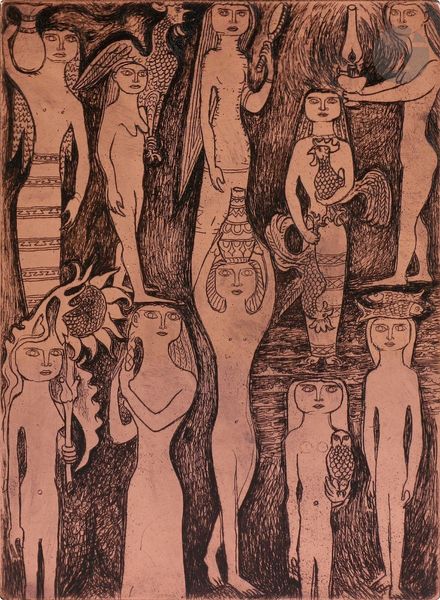 Curator: Here we have Edvard Munch's "Angst" at the Harvard Art Museums. Look at how the artist uses woodcut to convey such rawness. Editor: Raw indeed! It’s like a bad dream clinging to the surface, wouldn’t you say? The faces, the red streak in the sky… it's unsettling. Curator: Munch was experimenting with the materiality of printmaking, pushing the medium to reflect psychological states and the social anxieties brewing in Europe. Editor: I feel it. It’s claustrophobic, almost like being trapped in a crowded room where everyone is suffocatingly polite yet filled with unspoken dread. Curator: The process itself, the carving and inking, become part of the message about alienation and the pressures of modern life. Editor: It makes me want to scream, but politely, of course, as they do in the image. It’s amazing how he turned wood into a mirror of the soul’s dark corners. Curator: Exactly. It really speaks volumes about the constraints of the culture at that time. Editor: Makes you wonder about the wood, doesn’t it? What tree did it come from, and what secrets did it hold before Munch released this vision?