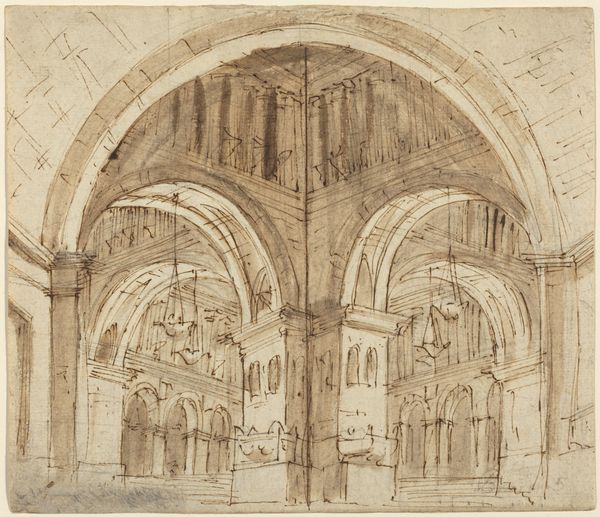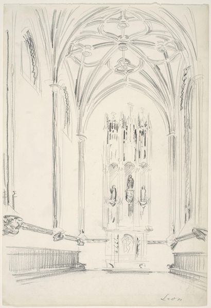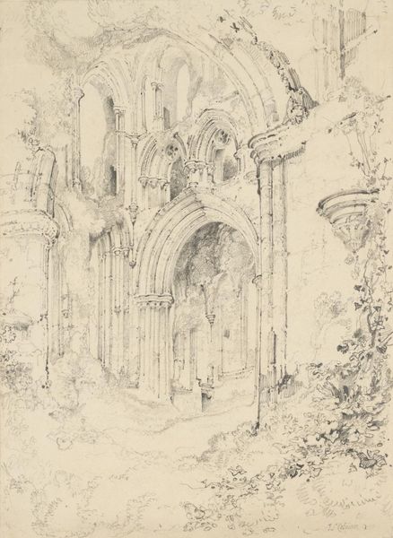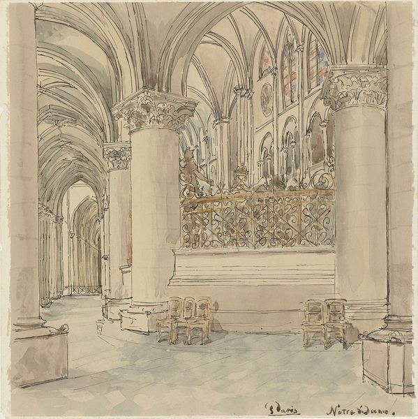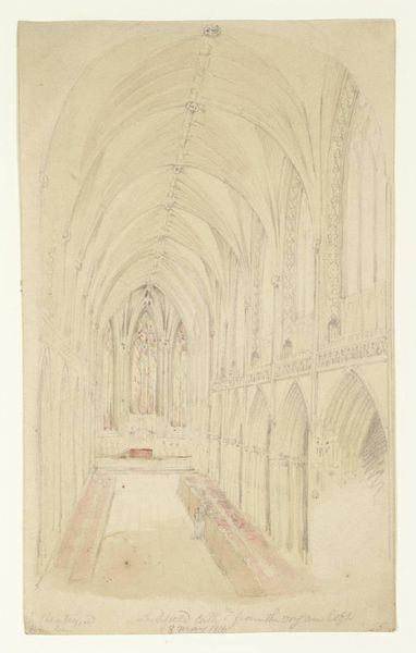 Editor: Here we have Louis Haghe's watercolor and ink drawing titled "Interior of a Church with a Wall Tomb and Medieval Font." The rendering is delicate, almost dreamlike. How would you approach interpreting the materials and techniques at play here? Curator: Well, consider what watercolour as a medium signifies. Its portability aided the proliferation of architectural studies in the 19th century, creating a visual archive but also fostering an aestheticization of ruins. Haghe's use of it invites questions: Was he commissioned by a patron, documenting the architecture for posterity? Or was it driven by market demand for picturesque scenes? Editor: So, thinking about its function as a commodity changes how we see the piece. I hadn’t thought about it like that. Curator: Exactly! The type of paper Haghe selected, the pigments he deployed, these all affect the artwork's cost, and by extension its market value. How does that affect its reception and position it within the art market? We must also not ignore the role of the patron, who probably stipulated certain requirements from the artwork, in addition to paying for materials and labor. Editor: It’s interesting to consider the labor too, his hand meticulously creating those details, especially on the tomb and archway. Was it a skilled job? Were those skills valued economically? Curator: Precisely! Think about the craftsmanship involved in rendering stone textures, or the perspectival accuracy in the architectural structure. It also points to the relationship between the artist, his labor and the patrons. Did this type of production have a place in a broader society? Who consumes and upholds it, and what do they believe about these aesthetic representations of sacred spaces? Editor: Wow, I see this piece in a new light now. It's not just a pretty picture, but a record of material and labor relations. Curator: Indeed. By focusing on these production and consumption contexts, we avoid simply seeing this drawing as beautiful. Instead, it can open into broader discussion around artistic patronage, market dynamics, and the artistic value assigned to craft.