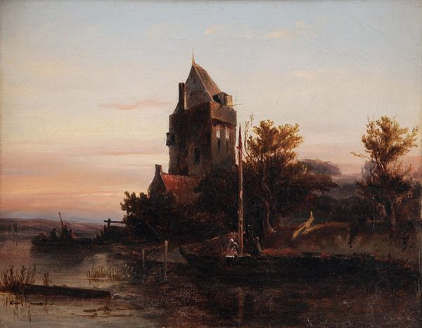 Curator: George Arnald's "View on the Ouse at York" captures a specific time and place. It's held here at the Tate Collections. Editor: My first impression is how atmospheric this painting is—almost dreamlike. The colours! I find it moody, yet strangely comforting. Curator: Arnald, painting during the Industrial Revolution, subtly hints at the changing landscape. See the smoke rising from the building? It speaks volumes. Editor: Absolutely. It's that tension between the idyllic river scene and the looming industrialization. Who benefited, who suffered? And at what cost? Curator: It’s a complex narrative, beautifully rendered. I feel invited to contemplate what progress really means. Editor: Yes, to question everything, even beauty itself. A stunning piece that lingers in the mind.