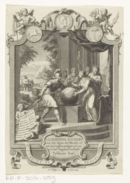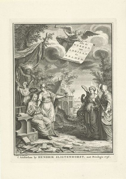Jan Caspar Philips created this monochrome engraving, "Faith, Hope and Love around an Altar," now at the Rijksmuseum, to measure 141 by 87 millimeters. The formal arrangement guides our eyes upwards from the weighty altar block to the ethereal light breaking through the clouds. Philips employs a classical architectural backdrop to frame the composition, with figures arranged in a semi-circle around the altar. This symmetry is disrupted by the dynamic rays of light, creating a visual tension between the earthly and the divine. The strong vertical lines and chiaroscuro give the figures volume. This image creates a complex interplay between reason and revelation. The altar and book symbolize established doctrine, while the hopeful upward gaze defies the fixed knowledge. This visual dialogue prompts us to reconsider the relationship between belief systems and individual interpretation. The work challenges the viewer to destabilize fixed meanings in favour of transcendent understanding.