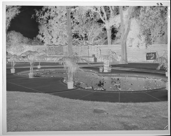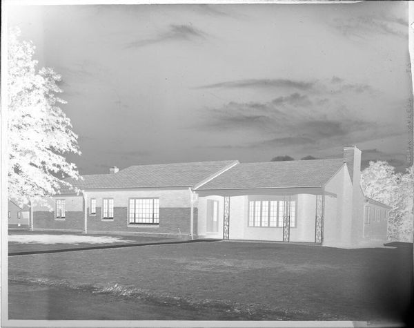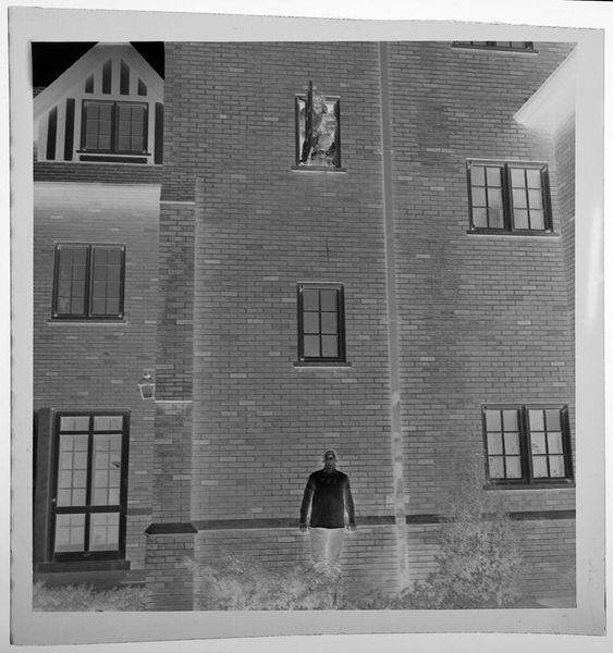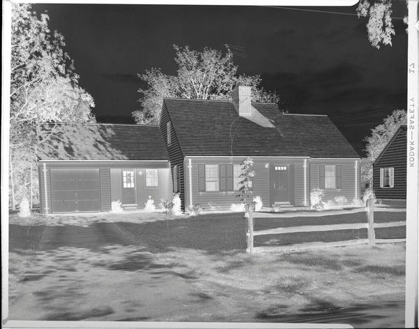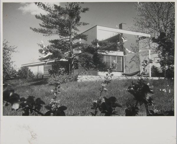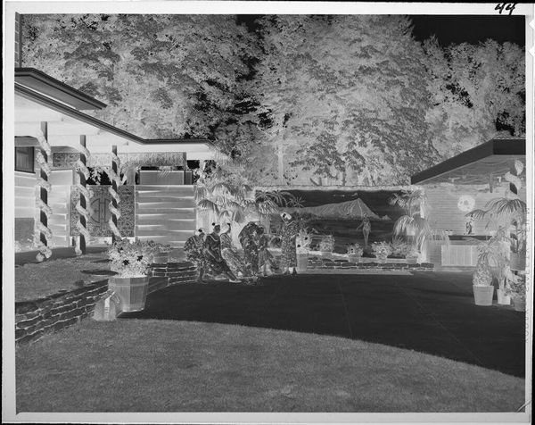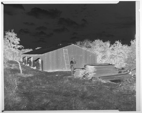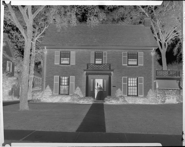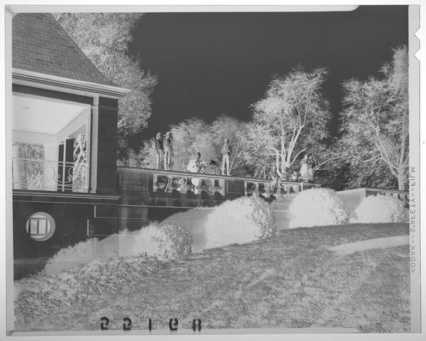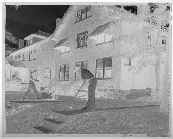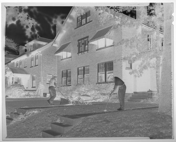 Curator: This is an untitled work by Jack Gould, currently held in the Harvard Art Museums. It captures two men mowing a lawn outside a large house. What strikes you first? Editor: It’s the stillness, almost ghostly. The inverted tones give this everyday scene a surreal, quiet energy. You almost hear the hum of the lawnmower, but in a dream. Curator: The image is a negative. This treatment transforms a familiar scene into something slightly unsettling. How does that affect its meaning? Editor: Well, it's definitely about the contrast between labor and leisure, right? The men are working to maintain this pristine space, but the photograph feels more about the emptiness of success. Curator: Interesting observation, the inverted color seems to highlight the socio-economic dynamic between the labor and the residence. Editor: Exactly, I hadn’t thought of it like that. It all feels a bit ominous, doesn’t it? But still, very beautifully composed. Curator: It makes you consider the social structures beneath the surface, doesn't it? Editor: Yes, what an eerie and beautiful slice of life.
