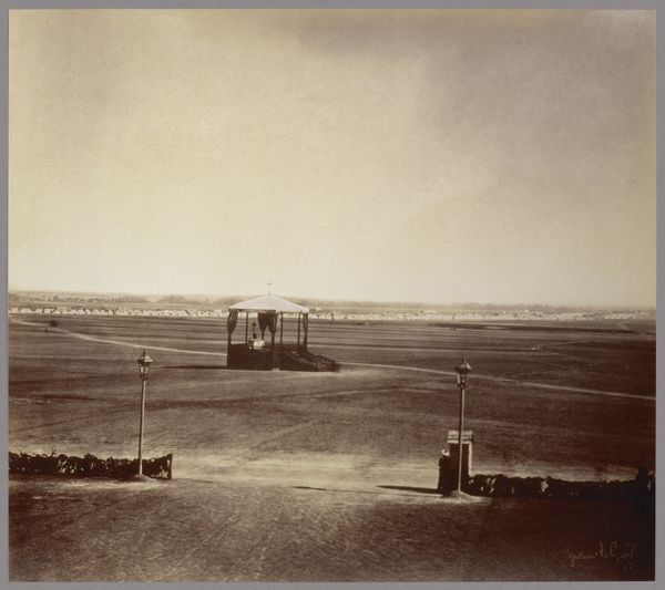 Curator: This is John Beasley Greene's photograph, "Temple de Deboud," created using the daguerreotype process between 1853 and 1854. Editor: The muted tones create a sense of antiquity. The horizon line feels vast and stretches back into time. The weight of history in the ancient architecture and also in this early form of photography. Curator: Absolutely. What’s compelling is Greene's approach. Instead of focusing solely on the temple's grandeur, he includes the landscape, highlighting the materials he was using but also the location the temple inhabited. We must remember this photograph involved extensive labor: from preparing the plates, the journey to photograph in situ to transporting equipment. Editor: And consider the visual language! The temple itself, a cluster of solid forms against that limitless sky. Temples like Debod were often dedicated to specific deities, serving as focal points for ritual and divine connection. It’s intriguing to imagine what Greene, photographing this site in the 19th century, made of those layers of meaning and faith. Curator: It's fascinating to me how Greene exploits the capabilities of the daguerreotype. Its mirror-like surface, the incredible detail it captures in the stonework, it’s not just about representing the temple, it's about capturing the light interacting with the temple materials. Editor: Yes, and that very interaction lends it an ethereal quality, almost a blurring between the sacred and the tangible. There’s a definite tension between preservation and interpretation that photography uniquely addresses. It asks questions about cultural memory and enduring legacy, which seems very apt here. Curator: In the end, this image reflects not just a place or structure, but a network of materials, labor, and evolving technological processes that facilitated this early modern vision of an ancient space. Editor: Indeed. Greene has composed more than just an image; he has presented an enduring testament to faith, memory, and how they intersect.
