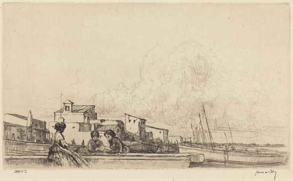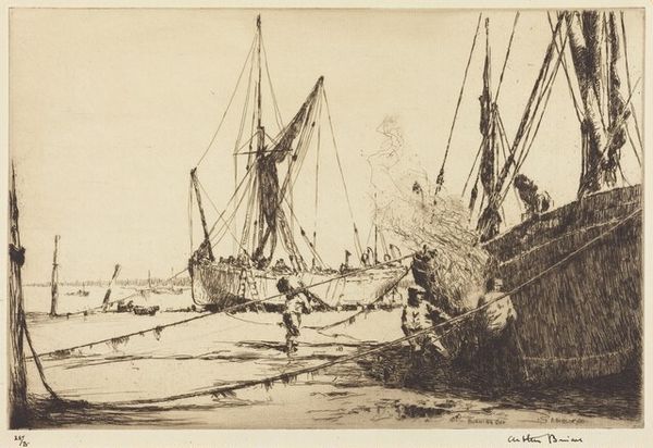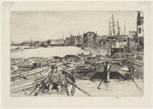 Curator: Whistler's "Limehouse" evokes a feeling of quiet industry. The composition, with its horizontal emphasis, creates a sense of stillness. Editor: And yet, it hints at the bustling maritime life, doesn't it? Look at the visible wear and tear on the buildings. You can almost smell the river and feel the grit of the docks. Curator: The etching medium provides a unique texture, a play of light and shadow which emphasizes the formal qualities of the work. Editor: Absolutely. The material process reveals so much. The line work shows the hand of the artist, engaging with the real labour and environment of London's docklands. Curator: Indeed, the etching's stark contrasts guide the eye through its carefully constructed space. Editor: It’s fascinating how Whistler captures a moment of intense industrial production with such subdued tones. Curator: Ultimately, this work allows us to contemplate the structure inherent in what might first appear as simple scene. Editor: Yes, and to connect with the lives lived in the wharves and waterways. It's an evocative glimpse into the labour of the port.