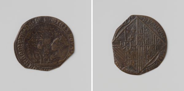 Curator: Immediately, the texture—that slightly corroded, time-worn surface—grabs me. It whispers stories of pockets, exchanges, and history. Editor: We’re looking at a “Hollandse dubbele stuiver,” minted in 1788. This piece of Dutch currency, part of the Rijksmuseum collection, features engraving and relief work on metal. Curator: And look at how that lion leaps from the shield. What does it say about Holland's identity, portraying its strength and asserting its power through visual representation? Even in miniature, symbols speak volumes! Editor: The symmetry is notable. The shield and crowned crest balance the composition on one face, contrasted by the straightforward lettering “Hollandia” on the other, almost a textual declaration. Curator: It's more than just text; it’s branding! "Hollandia" isn't merely a location. It’s an assertion of collective identity—the weight of generations who bartered with it, fought for it, and built upon it. Editor: Though small, consider the skill required to render such detail. The crown atop the shield isn’t simply ornamentation; it signifies governance, meticulously carved within that tiny space. It points to a high level of craftsmanship. Curator: The coin speaks volumes about 18th-century Dutch society. It's an artifact of daily life and echoes power structures. Each pass through the hands becomes a transaction across the threshold of social experience. Editor: Considering its relatively simple design elements, it is interesting to look at the overall presentation, one can almost reduce it down to its pure geometric shapes—circle, square, line— and the patterns they create in unison. Curator: Its very survival into our time adds an intangible value; holding history physically is what is captivating! This ordinary coin encapsulates a wealth of collective experience. Editor: Precisely, the intersection of art and object is captivating. Every visual element gives a sense of order, of meticulousness, and clarity—it is satisfying on a purely formal level.