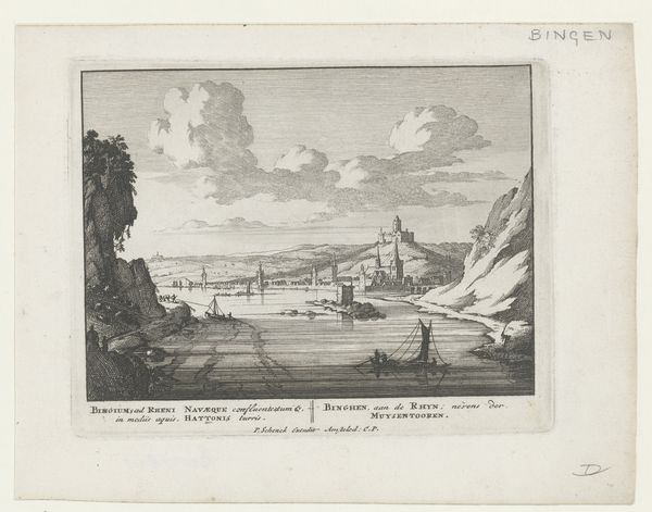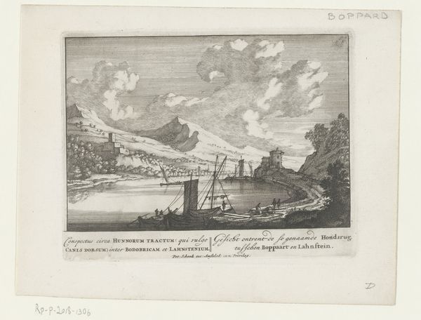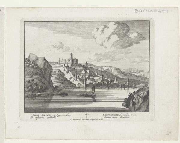 Editor: This is "Gezicht op Bonn," a print by Pieter Schenk, dating from around 1694 to 1697. It's an etching, depicting a cityscape along a river. The detail is quite striking. What visual elements stand out to you in this piece? Curator: The composition relies heavily on the interplay between light and shadow, achieved through skilled manipulation of line. Observe how Schenk varies the density and direction of hatching to render texture and form. The tonal range, although limited to monochrome, effectively conveys a sense of depth, wouldn't you agree? Editor: Absolutely. The way the clouds are rendered with such lightness, contrasting against the darker buildings and the riverbank, really creates a dynamic effect. I’m curious, how would you interpret the spatial relationships within the composition? Curator: Notice how the river serves as a central compositional device. It's flanked by two landmasses, that draw the eye into the scene and provide visual anchoring. The artist employed strategic placement of buildings and foliage to control perspective, effectively elongating the depth. Would you say it works effectively to establish the city's presence? Editor: It does, very much. I’d initially focused on the subject of the print - the city of Bonn itself, the boats – and how the details create a captivating cityscape. But thinking about Schenk's control over perspective and composition gives it a deeper appreciation. Curator: Indeed. By examining the formal elements, we move beyond a simple depiction of place and into the realm of artistic intention. Editor: Thanks to your perspective, I notice that it’s not just what is depicted, but how it is depicted. Curator: Precisely, and in grasping how, we draw nearer to understanding the image itself.