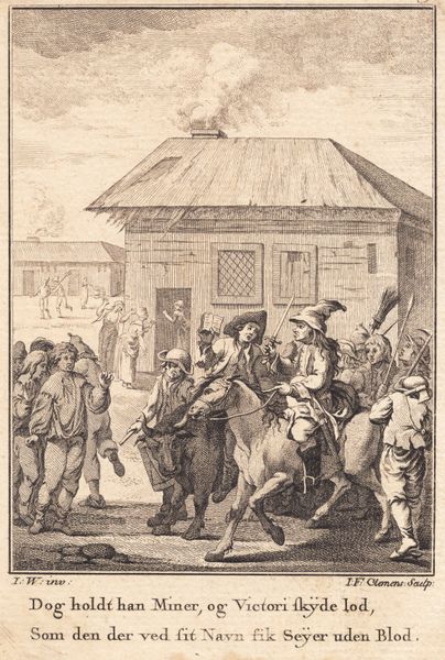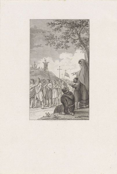 Editor: This is Jacob Smies's "IJsvermaak op een stadsgracht bij een molen," or "Ice Skating on a City Canal by a Mill" done sometime between 1774 and 1833. It's a drawing in ink on paper. The scene feels so full of energy, almost chaotic, despite the limited color palette. What compositional elements strike you most when you look at this work? Curator: Immediately, the asymmetry is apparent. The stark tree branches on the upper portion oppose the implied activity below, creating a formal tension. Consider how the artist deploys the structural device of the horizon line. Editor: How so? Curator: The buildings and the suggestion of the windmill are relegated to a background role and are positioned to one side, yet define much of the top line of the horizon and a feeling of spaciousness, but not of balance. Moreover, Smies’s deployment of ink tonalities gives a somewhat agitated effect, perhaps reflective of the joyful exuberance in the human activity. What are your views on his deployment of representational space? Editor: It is interesting how the characters at the forefront have greater scale and a greater definition to their forms. Whereas, towards the background, the human figures become far less detailed, as you say, pushing them more into the background. This really heightens that sensation of space in the composition. I suppose I was focusing so much on the immediate, anecdotal image and what the scene might tell us about Dutch life. Thank you for focusing my eye on the more formal qualities of Smies’s work! Curator: Indeed. The apparent simplicity initially belies a network of highly developed artistic gestures and decisions.
