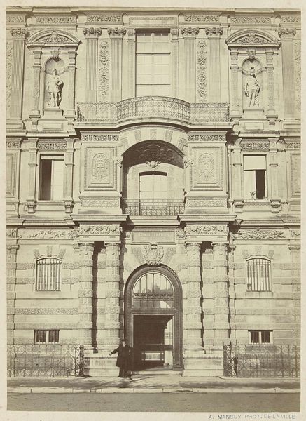 This photograph, "Munich - Meiserstrasse?," was taken by Andy Warhol, and printed on photographic paper. The silver gelatin print captures the facade of a building. It’s all about the tones of gray, from the almost white stone to the deep black of the window frames. Looking at the surface, it's fascinating how the light plays on the rough texture of the building. You can almost feel the grit of the stone. It's not a slick, perfect image; it’s got that raw, documentary feel that Warhol sometimes went for. Notice how the windows punctuate the surface and imply depth. The way the light reflects and refracts emphasizes the architectural form of the building. This piece kind of reminds me of Bernd and Hilla Becher, those German photographers who systematically documented industrial structures. Warhol captures something similar here, a kind of cool, detached observation. But, as always, he brings his own sensibility to it, making this an interesting experiment in perception and representation.