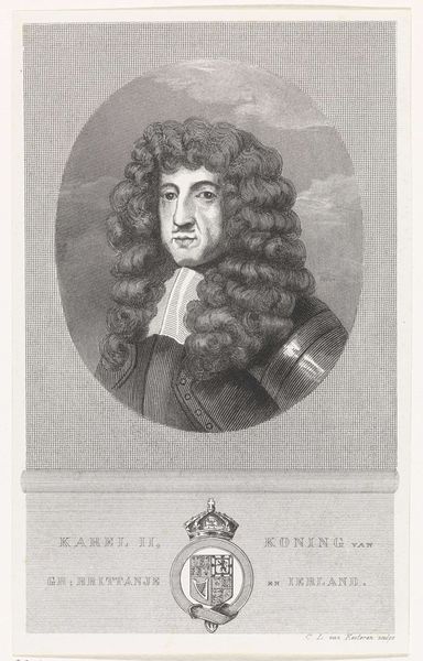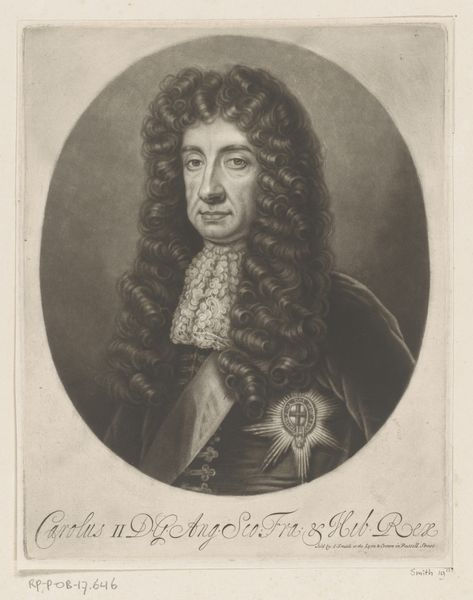 Curator: Welcome to the National Portrait Gallery. Today, we’ll be discussing Mary Beale’s depiction of "King Charles II," painted around 1675. Editor: My immediate reaction is one of subdued opulence. The oval composition and the framing draw my eye directly to his face, while the browns and blacks evoke a rather serious tone, despite the undeniable richness of his garments. Curator: Indeed. This portrait captures Charles II during a complex period of English history. Beale, as one of the first professional female painters in England, navigated a male-dominated art world, securing commissions like this through skill, but also, astute social maneuvering. She was capturing more than just a likeness. She captured the monarchy's restored authority. Editor: The rendering of light here, specifically, is masterly. See how it catches the edges of his lace cravat and illuminates his face, creating depth and guiding our attention. There is a clear Baroque influence in the dynamism, wouldn't you agree? Curator: Absolutely. But consider what it meant for Beale, as a woman, to paint a King in this era. Portraiture served not just aesthetic but also political functions. Beale’s image of Charles reinforces his position after the turbulent Cromwellian period. These commissions cemented not only the monarchy’s standing, but her own. Editor: I do think his eyes are interesting - conveying a weary intelligence. This, set against the texture and luxuriousness of his wig and clothing creates such a beautiful play of contrasts, almost as though trying to depict the complexity of the sitter through pure composition alone. Curator: A complexity deliberately constructed, I'd argue, keeping in mind the visual politics of the period. A painter of the Royal court did not necessarily have free rein to create, interpret, and define their subject's persona freely. The painting served the man, and by extension, his social and political agenda. Editor: It certainly brings up some points to think about. A lot is expressed in his presentation. Curator: Indeed. The painting is much more than it appears. It speaks volumes about social positioning, gender roles, artistic license, and Britain in the late 17th Century.