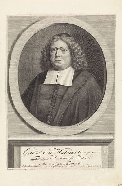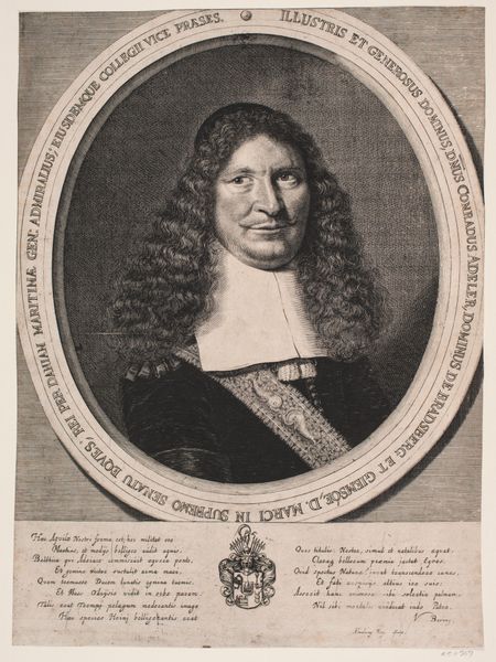 Curator: I see Petrus Aeneae's "Portret van Jacob Rhenferd," an engraving dated between 1680 and 1700. It strikes me as rather formal, almost austere, even with the baroque flourishes. The detail in the clothing and hair is amazing. What are your initial thoughts? Editor: It’s a beautifully rendered print. I am struck by the skill it must have taken to create such fine lines. Considering it’s a print, how does that influence its context as an artwork in that period? Curator: Exactly! Let's consider the materiality of this engraving. Engravings are inherently about reproduction, making images accessible to a broader audience. Who could afford or even see this man otherwise? And what materials were available to the artist? The paper, the ink, the tools. They all speak to a specific moment in technological development and access to resources. We can't ignore the labour involved, too. How many prints could Aeneae make, and who would have distributed them? It wasn't simply the creation of *high art* we can witness but instead a skilled labour. Does this change your perception of the artwork? Editor: That’s fascinating. So it's less about individual genius and more about access, labour and distribution of a potentially reproducible object? I'd never considered the implications of that. Curator: Precisely. By focusing on the materials and production, we can see how "art" is enmeshed within broader economic and social systems, challenging our modern-day notions about artistic genius and unique art objects. Editor: That makes me appreciate the print even more now. I’m going to start seeing all art differently! Curator: Me too. Let’s find out how printing enabled the dissemination of knowledge during the 17th century!