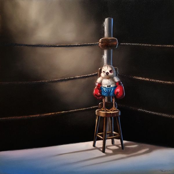 Curator: Here we have "Gym Rat", a delightful oil painting by Lucia Heffernan. Editor: Well, isn't that a charming, slightly unsettling juxtaposition. The sheer visual irony is rather palpable! A rodent...boxing? The composition is strangely captivating. Curator: Indeed. Note how Heffernan uses a genre painting style to portray a very unusual subject: an anthropomorphized white rat assuming a martial arts pose. The textures are remarkable, particularly the way she handles the fur and the glossy boxing gloves. Editor: The artist's material choices also reflect deeper social themes. Oil paint is a traditionally upper-class medium. Painting this scene with that specific medium and in such careful, traditional technique lends this comical rodent dignity, maybe even suggesting commentary on access and labor. Even that roughly-sewn punching bag contributes. Curator: Interesting take. Structurally, the high-key value of the rat immediately attracts the eye against the somber background. Observe the use of lines - the diagonal of the raised leg contrasting to the rigid vertical lines of the punching bag. A somewhat dynamic composition overall, wouldn’t you agree? Editor: Yes, I agree! Look closely at the textures on the boxing gloves, almost like car tires in miniature form. They give the image depth and suggest an actual manufacturing process and the creation of labor in commodity goods, don't you think? The means of production become a subject, not just a background. Curator: I suppose one can see that interpretation. I was leaning towards analyzing how the light subtly emphasizes the figure and delineates it from its environment. The semiotic play between the predator image of the cat crudely drawn on the bag, juxtaposed with our gym rat hero… brilliant, really! Editor: Exactly. The cat sketch references a predator, but consider what that hand-drawn crudeness communicates about its creation. Someone made that, with very clear intent. The artist is not shying away from the messy human labor involved in making symbols. Curator: Food for thought. It appears our pugilistic rodent contains more layers than one might initially presume. Editor: Absolutely. And for me, it truly illuminates art’s social fabric woven into the very techniques the artist employs.