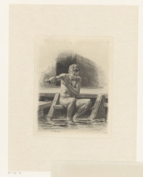 Curator: This etching from 1912, created by Anders Zorn, is titled "The Hair-Ribbon". Editor: The piece seems a bit stark, almost unfinished, with all the hatching and crosshatching used to create its shading and tonality. Curator: As a print, its material existence stems directly from the metal plate, the acid, the press—the tangible elements. Each line represents the labor, a deliberate act of inscribing, quite unlike painting where gestures can be concealed, perhaps even more so when the scene depicted is a nude one. Editor: Speaking of which, her pose has a classical air, don't you think? She's seated, somewhat contemplative, the dark hair-ribbon acting as a framing device. There's a tension in the composition. Curator: Yes, the interplay of light and shadow draws the eye immediately, specifically in this piece as the dark backdrop suggests an undefined and somber domestic space, one created via many marks. Editor: I'm wondering what exactly the woman in the portrait is looking at, considering the gaze isn't directed at the viewer but turned instead to the side—we see only a fragment of her environment and life as a whole. It evokes questions about female labor as it occurs behind closed doors. Curator: Agreed, and Zorn's technical skill highlights form with an almost sculptural presence despite the relatively flat character of the etching process itself. The marks perform as much as they record the world before his eyes. The subject seems caught at a turning point, self-contained and absorbed within her individual reality, despite what might await her outside. Editor: Thinking about how an image such as this circulated historically as a kind of readily available printed matter feels radical given the current setting within the context of a museum collection, however fine the artistic skills are displayed throughout. Curator: Precisely. This detailed observation reveals a world rich in social nuance and layered meanings and implications about the female form. Editor: An apt conclusion to considering the implications behind the printmaker's means of representing labor and life at once, while raising important considerations around viewing today.