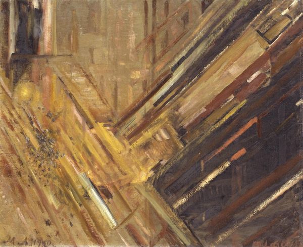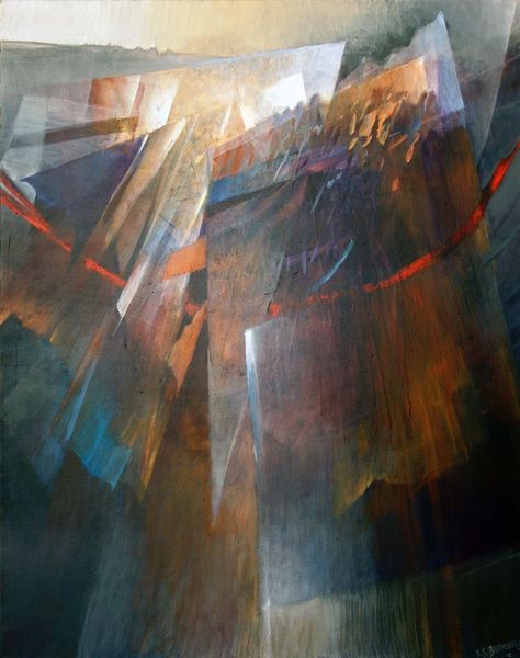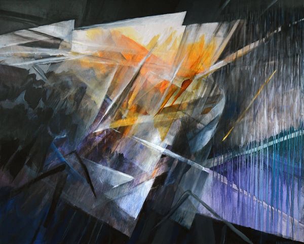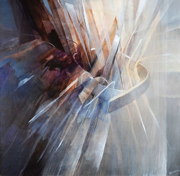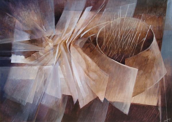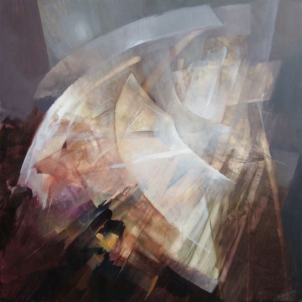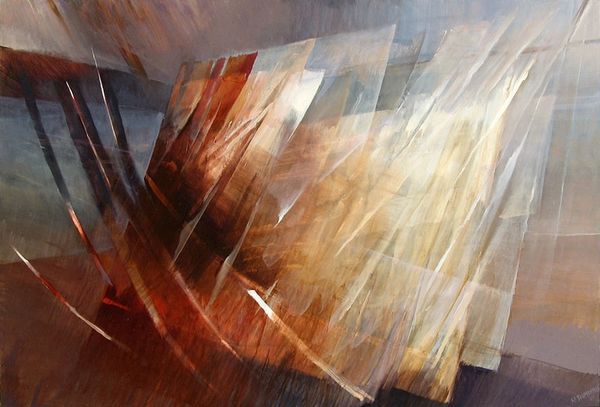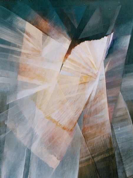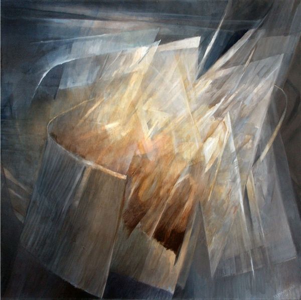 Editor: We're looking at "Moving Forward," an acrylic painting by Rochelle Blumenfeld from 2009. It’s really interesting how the geometric shapes seem to burst outward from the center. It feels dynamic, like an explosion frozen in time. What do you see in this piece? Curator: The energy certainly captures the eye. To me, these converging and diverging shapes aren't just abstract forms. They are potent symbols. Think of how throughout history, light itself has been used to represent knowledge, divinity, progress. The movement in this piece... does it suggest to you a striving towards enlightenment, or perhaps a shattering of old structures? Editor: I can see both. There’s definitely a sense of breaking away, but toward what, exactly? Is it a positive or negative kind of change? Curator: Precisely. Ambiguity is the soul of symbolic language. Consider the palette – earthy tones, predominantly. Could these represent a grounding in the physical world, with those lighter rays striving for something beyond? Perhaps the painting references a tension between the material and the ethereal. It resonates with the cultural memory of spiritual awakenings in art, such as the Renaissance. Editor: So you’re saying it could be tapping into something deeper in our shared consciousness, even if we can't articulate it directly? Curator: Exactly! Blumenfeld’s abstraction becomes a vessel. It reminds us that images often operate on a subconscious level, shaping our perceptions. The interplay between form and color creates a visual metaphor – one we interpret through our individual and collective histories. What has been revealed for you from this reflection? Editor: I definitely appreciate the connection to history and cultural symbolism. I now see this isn't just about shapes and colours but about broader human experiences. Curator: Indeed! Art is about visual signs as evidence of thought made visible and thought experienced.