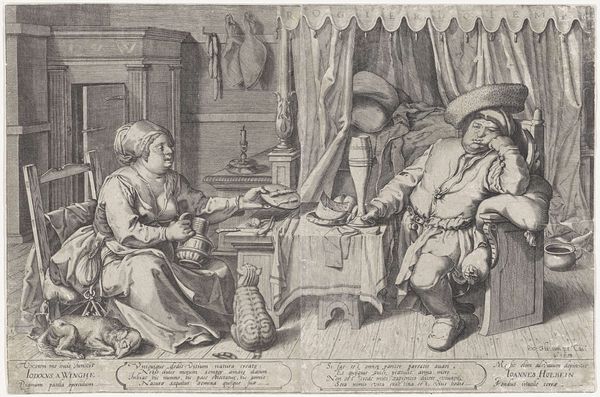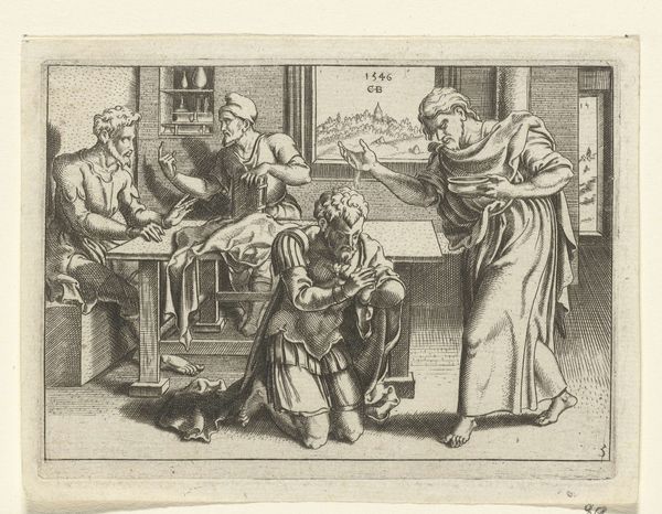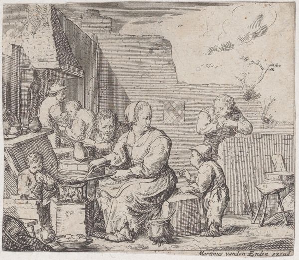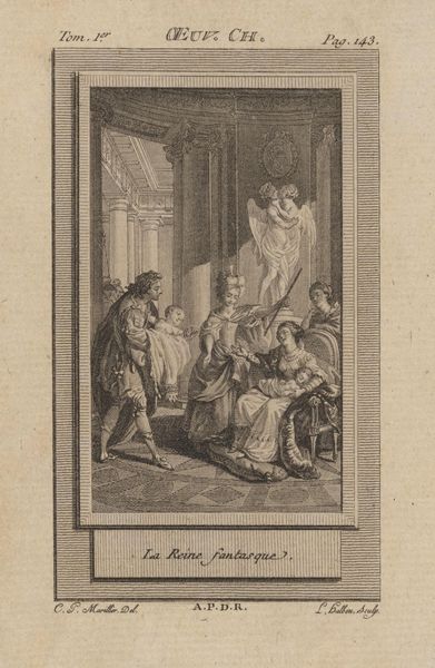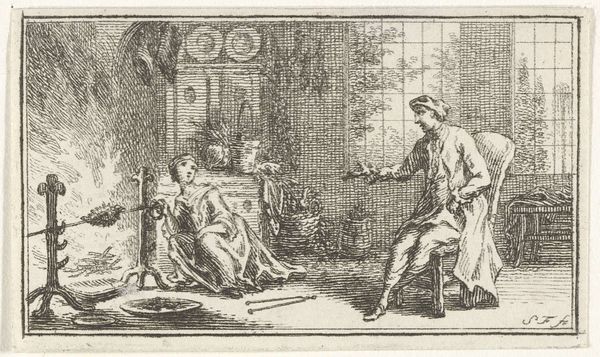 Editor: So, this is "The Slave Merchant," an etching and print by Claude Augustin Duflos le Jeune, created sometime between 1746 and 1747. The scene feels incredibly staged, theatrical almost. What historical factors might have influenced how this work was received by the public? Curator: Well, consider the period. It’s mid-18th century, the height of the Enlightenment in Europe, but also a period deeply enmeshed in colonial expansion and the transatlantic slave trade. Genre scenes like this, seemingly depicting everyday life, often served to exoticize the "Orient," a broad, ill-defined concept for the Near East and North Africa, while simultaneously reinforcing Western power structures. How do you see that power dynamic playing out here? Editor: I notice the composition divides neatly into two: the merchants counting coins, and the women huddled together looking dejected. Is it meant to serve as moral commentary, do you think? Curator: It’s tricky. We have to be cautious of projecting contemporary values onto the past. While the artist might have aimed for some level of critique, these images also participated in a broader cultural fascination with and objectification of non-European people. Etchings like this circulated widely. Where might they have been displayed, and for whom were they intended? Editor: Maybe in wealthy homes? To spark conversation… or just reinforce existing prejudices? So, the market demand itself, irrespective of the artist's intention, could contribute to harmful narratives. Curator: Precisely. And the Baroque style itself, with its theatrical flair, further shapes our reception. Does it encourage empathy, or does it distance us from the scene, turning it into a spectacle? Editor: I guess I hadn’t considered how the style could itself become another layer of complexity in interpreting the work's cultural role. I learned a lot; thank you! Curator: It’s fascinating how even seemingly simple images can reflect broader power dynamics. It definitely gives a new perspective when studying artworks!