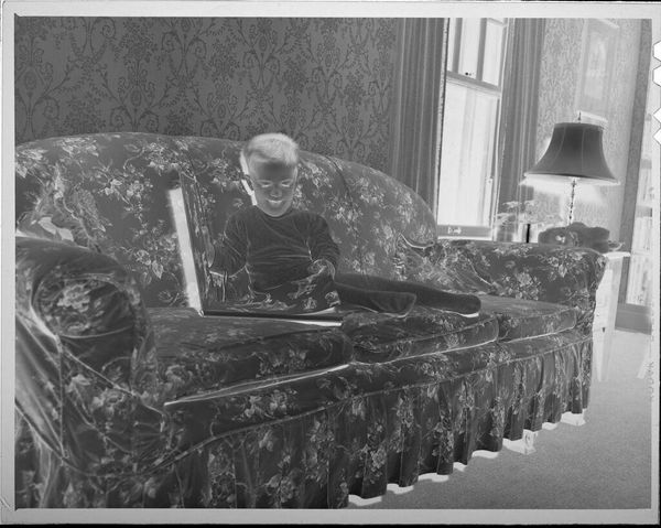 Editor: This photograph, "Untitled (boy reading newspaper on couch)" by Lucian and Mary Brown, captured on a 5 x 4 inch film, presents a rather intriguing, almost domestic scene. What do you see within its composition and contrasting tones? Curator: The stark inversion immediately commands attention. Note how the interplay of light and shadow sculpts the forms, emphasizing the geometric tension between the floral wallpaper and the sharply defined lines of the furniture. The boy's focused gaze draws us into the implied narrative. Editor: It’s interesting how the inversion highlights the textures and patterns. Is there something about the overall structure that you find particularly compelling? Curator: Indeed. Observe how the diagonal lines of the couch and the newspaper disrupt the rigid verticals of the background, creating a dynamic visual field. The photograph resists simple categorization.
