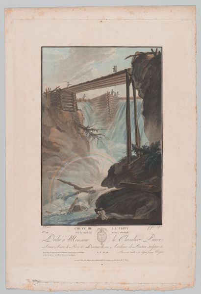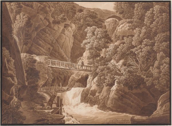 Editor: This watercolor, "A Bridge on the River Ticino, near Polleggio," by William Pars, captures a dramatic scene. The scale feels intimate, yet the subject is grand. What do you see in this piece? Curator: It’s a dance, isn't it? A dialogue between the human touch—that delicate bridge—and nature's raw power. Pars frames nature, literally, taming it for our contemplation, yet the cascading water defies such control. I wonder, are we meant to feel comforted or confronted? Editor: Confronted, definitely. I hadn't considered that tension. Thanks! Curator: The play of light is also very telling, the way the white of the water almost glows in contrast to the darker rocks. It shows nature's beauty but also its inherent danger. It is almost a metaphor for life! Food for thought, wouldn’t you say?